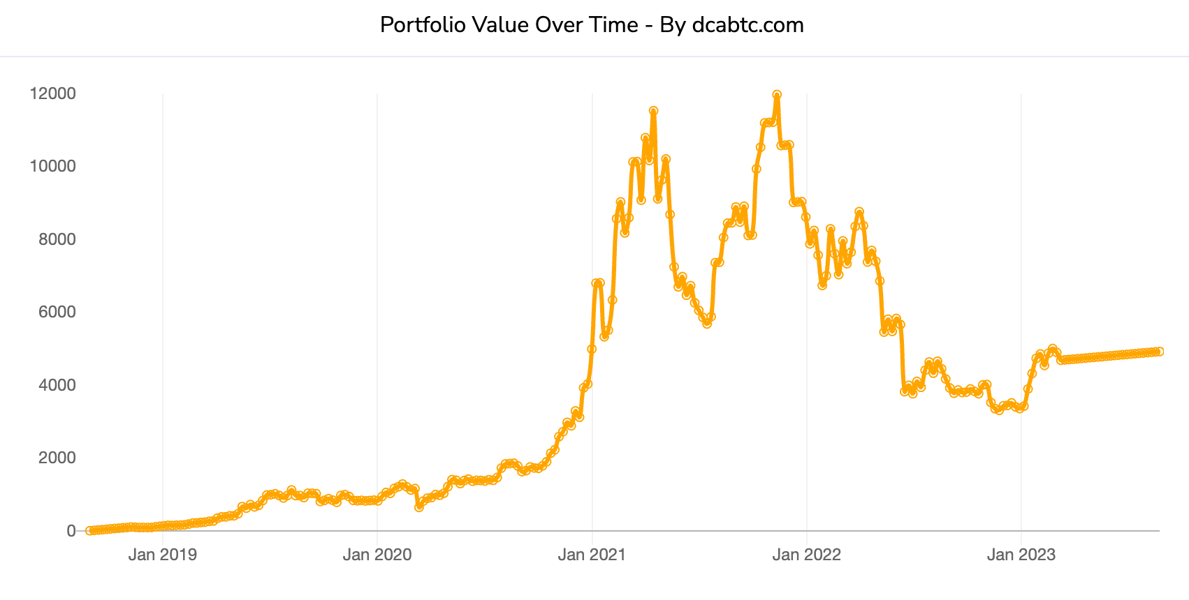 아래는 지난 5년 동안 매주 10달러씩 비트코인에 투자한 결과입니다. 큰 금액은 아니지만 성과는 훌륭합니다. 이러한 방식으로 꾸준히 투자하면 시장의 변동성에 크게 영향받지 않으면서 스트레스 없이 장기적으로 높은 수익률을 얻을 수 있습니다.