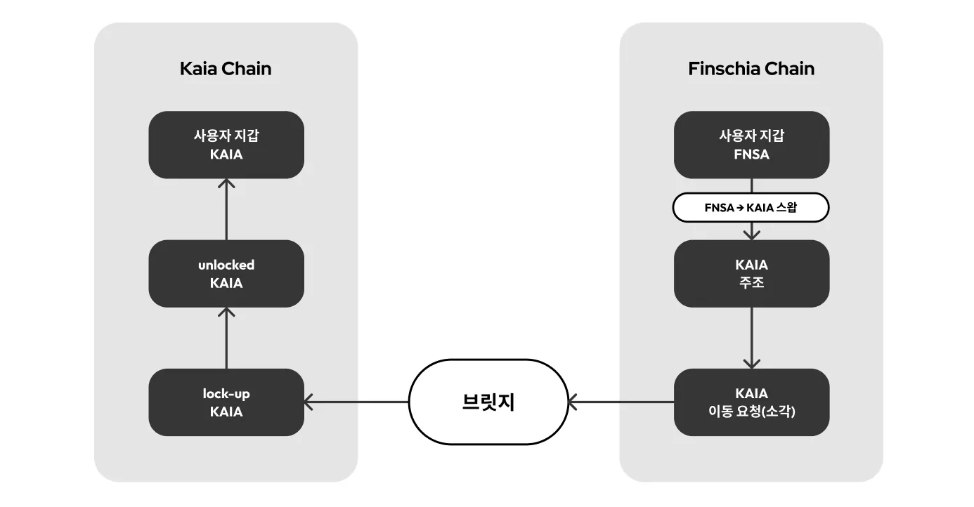 아래의 브리징 과정을 통해 핀시아 체인과 클레이튼의 자산이 모두 통합될 예정이며, 최종적으로 카이아 체인의 $KAIA로 전환될 예정이다. 카이아 출시 이후 당분간 티커는 $KLAY가 사용되며, 이후 $KAIA로 순차적으로 업데이트될 것으로 보인다.