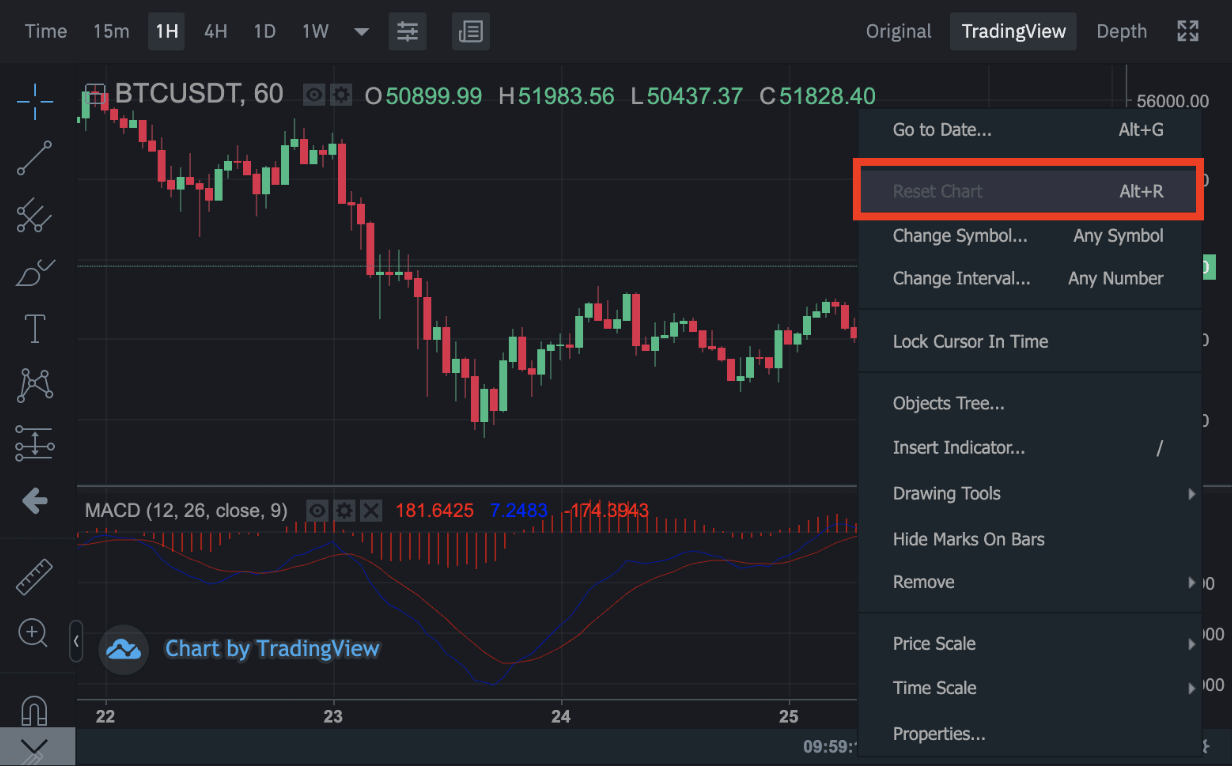 트레이딩 뷰에서 지표를 삭제하거나 그림 등을 삭제하고 싶다면 추가한 각 지표 및 그리기를 한 번 클릭하고 휴지통 모양을 클릭하면 됩니다. 만약, 차트 전체를 초기화 하고 싶다면 차트의 빈 곳에서 우측 버튼을 눌러 차트 초기화 [Reset Chart]를 클릭하시거나 단축키 [Alt + R]을 누르시면 됩니다.