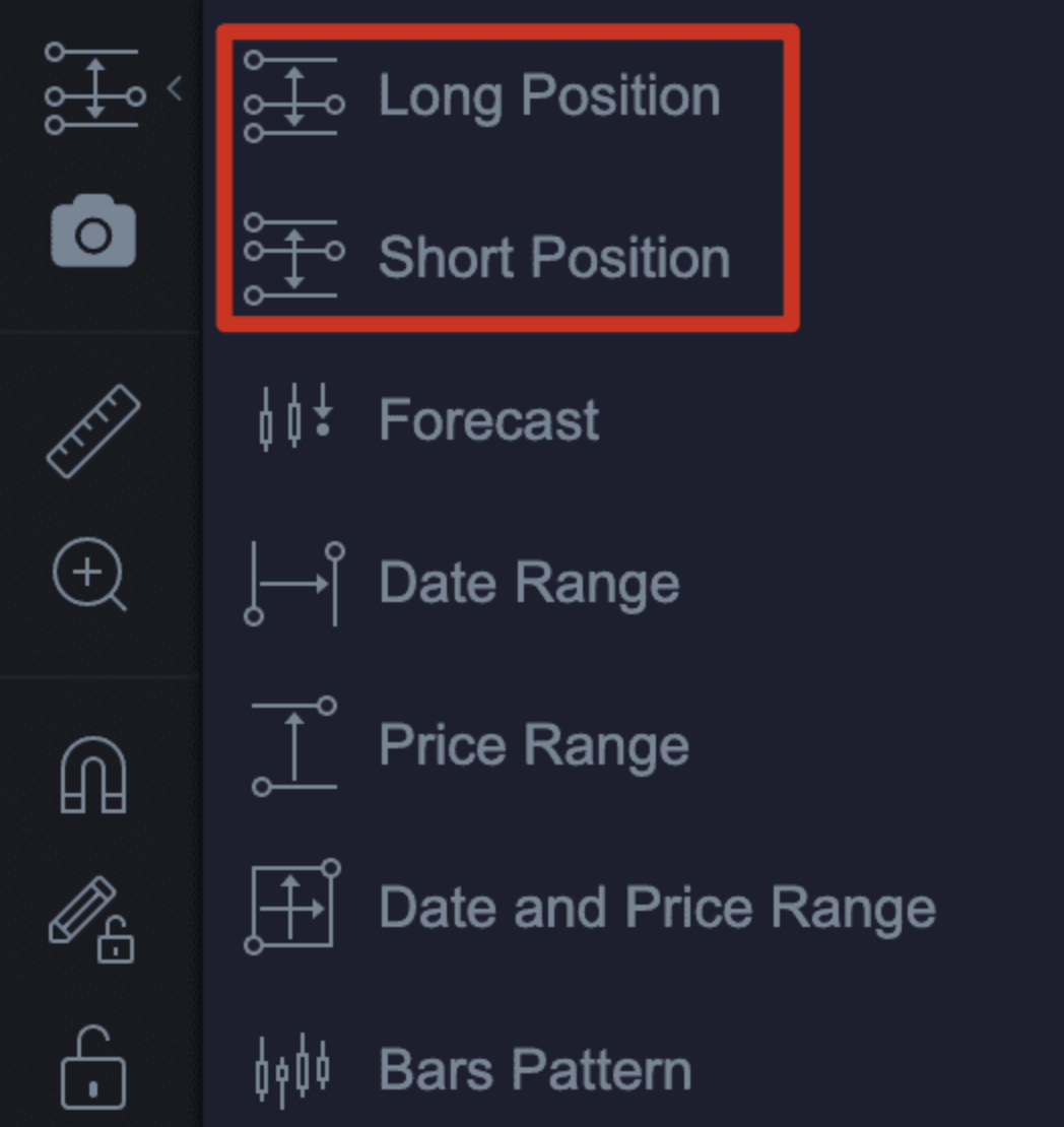 롱/숏 포지션 도구를 사용하려면 롱 포지션 [Long Position] 또는 숏 포지션 [Short Position] 도구 중 하나를 선택하세요. 다음으로 차트를 클릭해서 롱/숏 포지션 손익을 표시하세요.