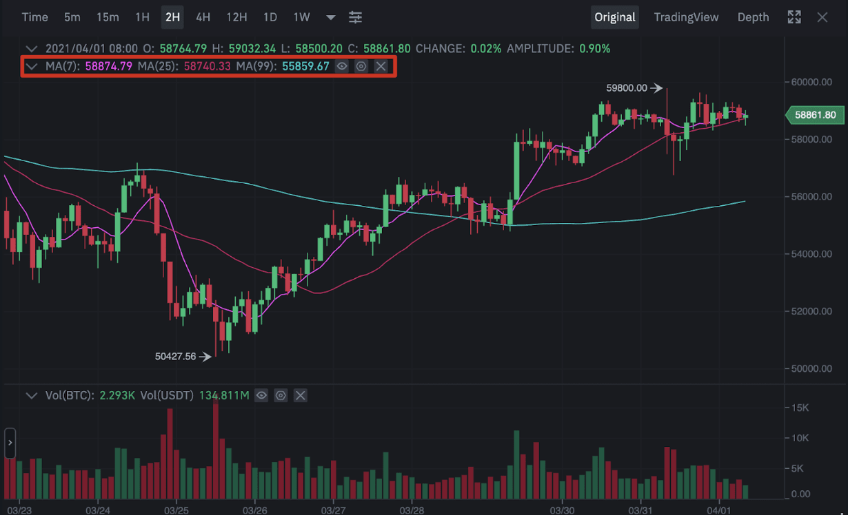 트레이딩 뷰가 활성화되면 아래와 같이 자동으로 이동 평균(MA)이 활성화되어 있는 것을 보실 수 있습니다. 이동 평균은 거의 모든 트레이더들이 활용하는 지표로, 설정 [Settings]에서 이동 평균 값을 설정하실 수 있습니다.