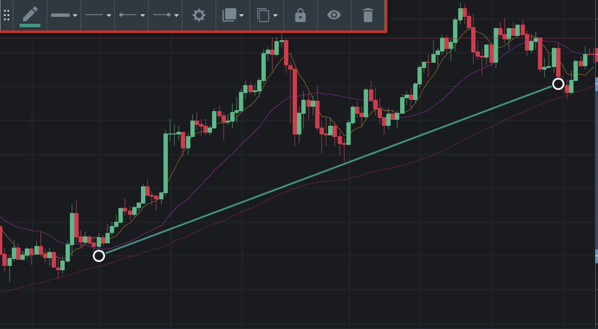 아래 차트처럼 간단히 추세선을 긋고 시장 진입 시점을 파악해볼 수 있습니다. 추세선의 색상 등을 변경하려면 추세선을 한 번 클릭하면 옵션이 표시됩니다.