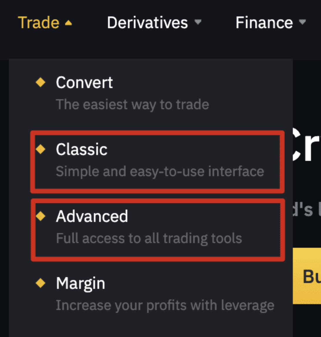 1. 바이낸스 계정에 로그인한 다음 거래 [Trade] 탭으로 이동하세요. 다음으로 클래식 [Classic] 또는 고급 [Advanced]를 선택하세요.
