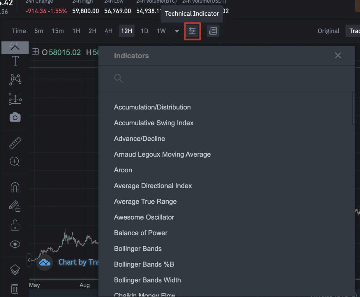 트레이딩 뷰 차트에 볼린저 밴드, 거래량, MACD 등 다양한 보조 지표를 추가하고 싶다면 타임 프레임 설정 옆에 있는 아래의 아이콘 [Techinal Indicator]를 클릭하세요. 이곳에서 원하는 기술적 지표를 추가하실 수 있습니다.