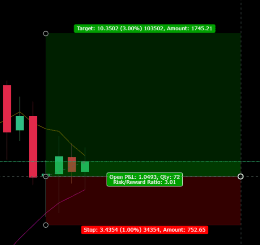 초록 부분은 목표가(잠재적 수익)를 보여주며, 빨간 부분은 스탑 로스(잠재적 손실) 부분을 보여줍니다. 가운데 부분에는 위험/보상 비율이 표시됩니다.