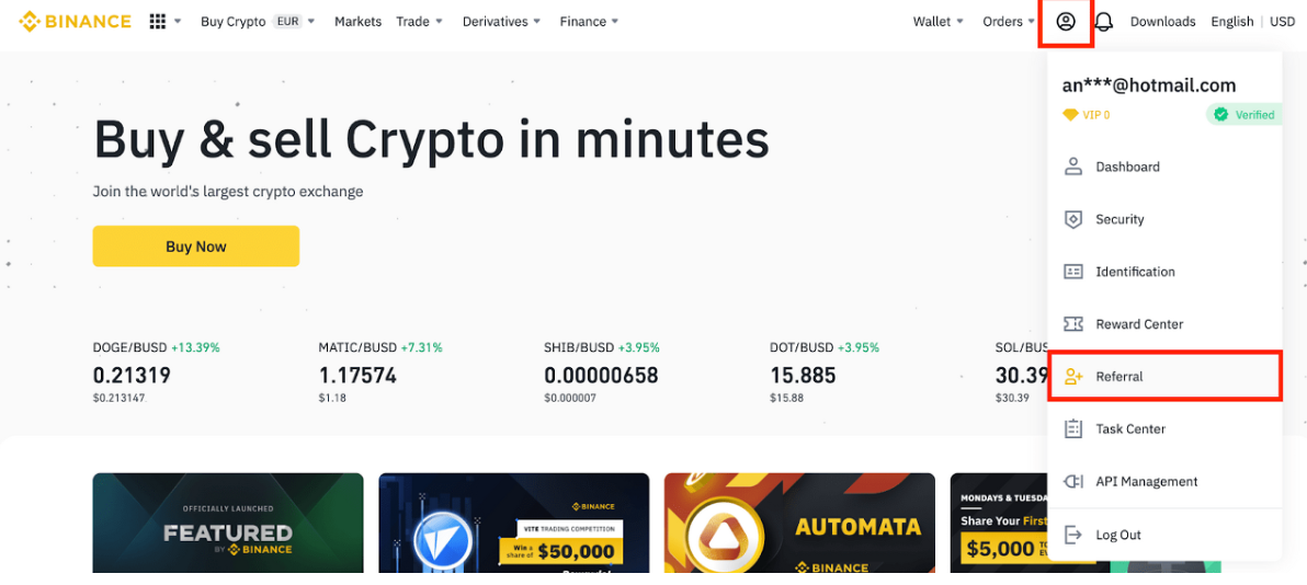 1. 바이낸스 계정에 로그인하고 [프로필] - [레퍼럴]을 클릭합니다.