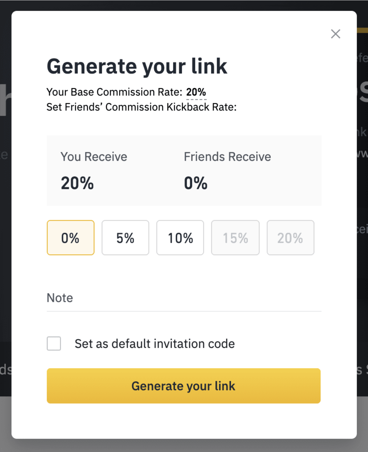 3. 현물 레러펄 비율을 선택합니다. 기본 현물 레퍼럴 비율은 20%이며, 이는 친구가 지불한 현물 거래 수수료의 20%를 받게 된다는 의미입니다.