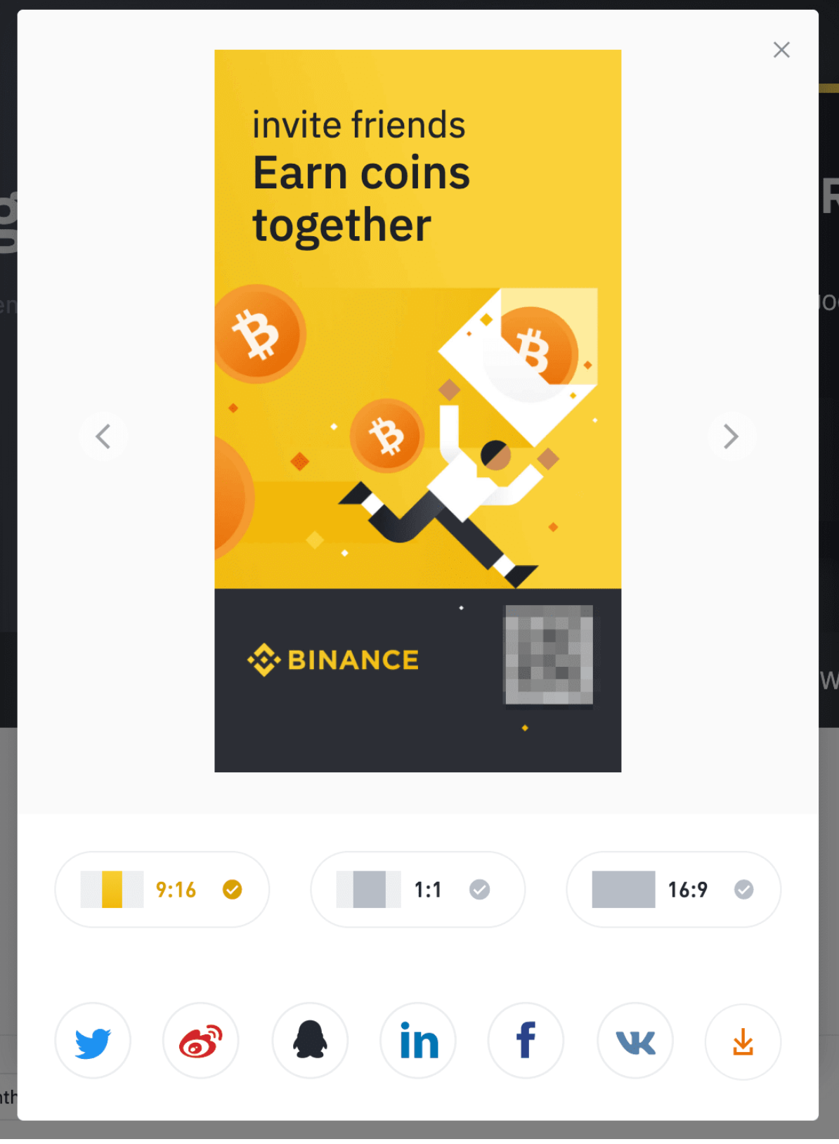 [지금 초대]를 클릭하여 추천 QR 코드를 공유할 수도 있습니다. 다양한 크기의 이미지를 다운로드하거나 다양한 소셜 미디어 아이콘을 클릭하여 직접 공유할 수 있습니다.
