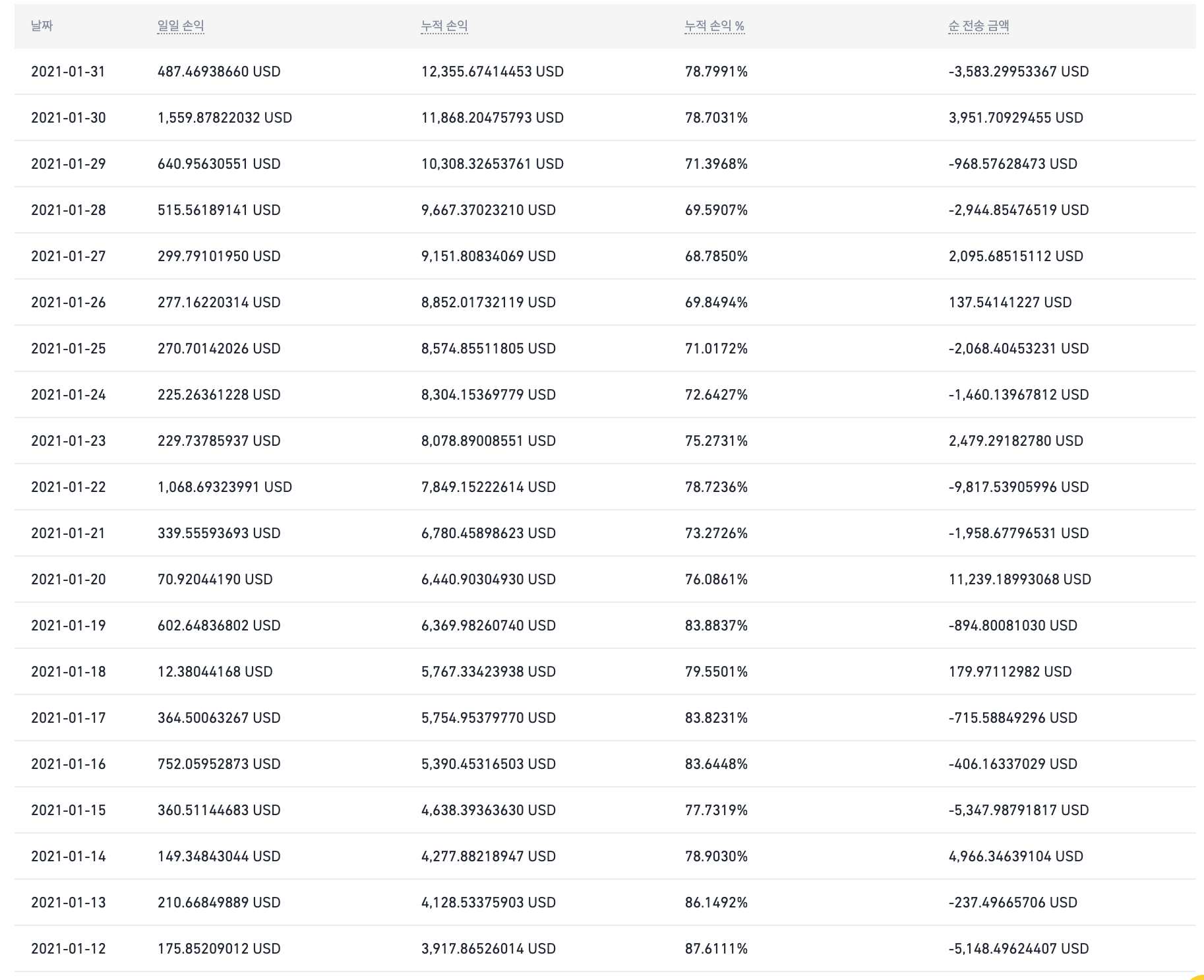 1월 아주 초반을 제외하고는 하루에 적게는 10불에서 많게는 1500불이 넘게 수익을 올릴 수 있었습니다. 큰 한 방을 노릴 수도 있겠지만, 이렇게 하루하루 꾸준히 수익을 쌓아가는 것도 만족할만한 수익이 될 수 있다는 것을 경험할 수 있었던 한 달이었던 것 같습니다.