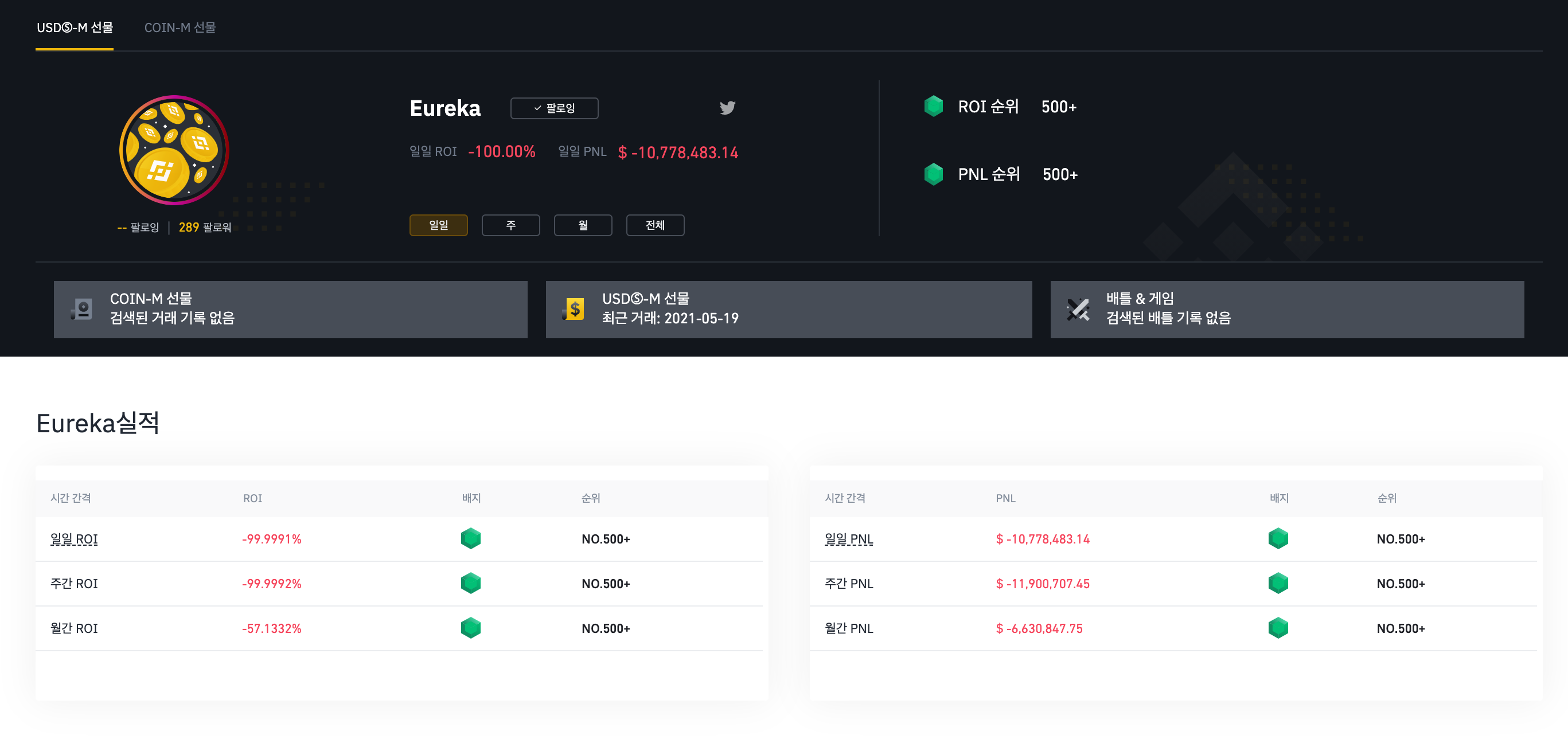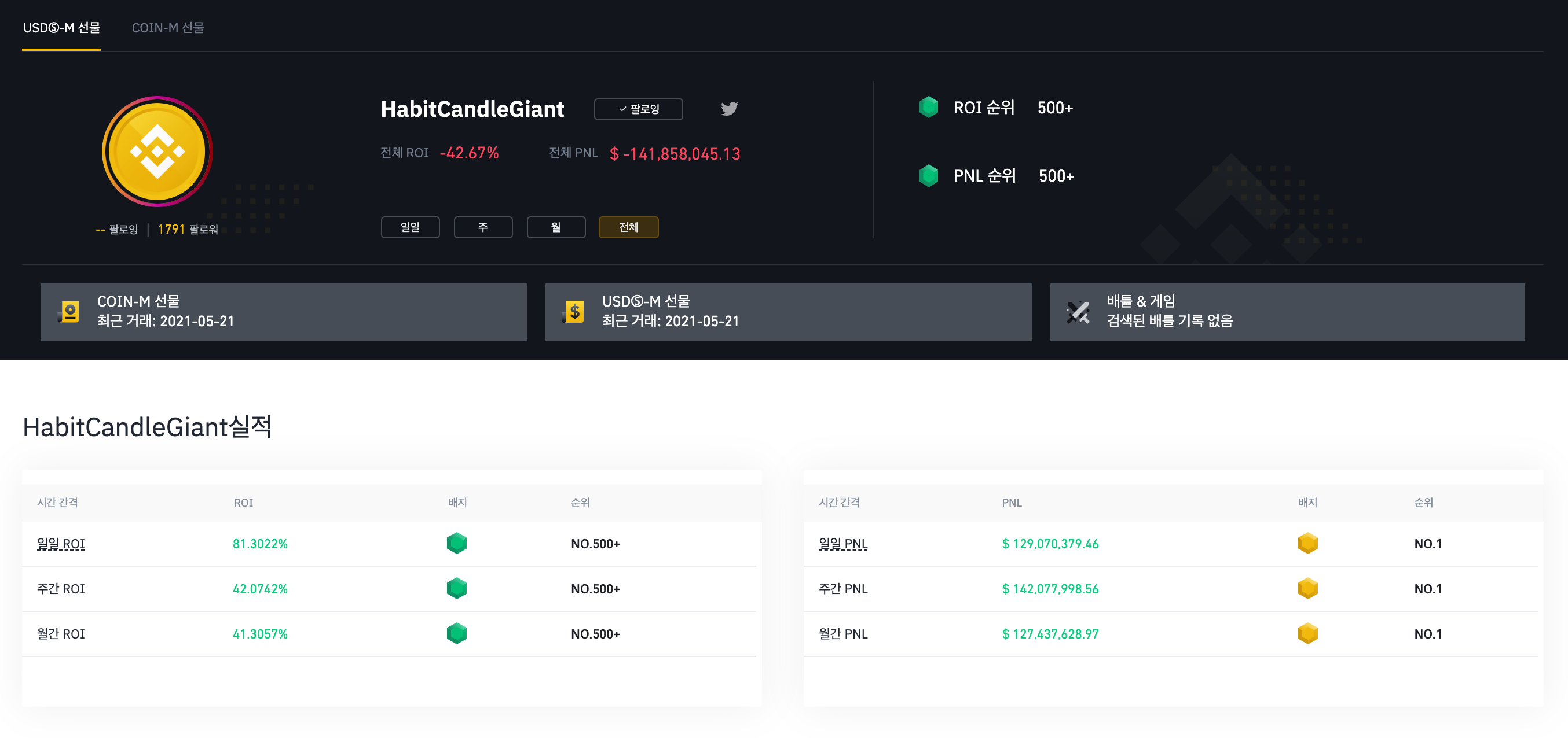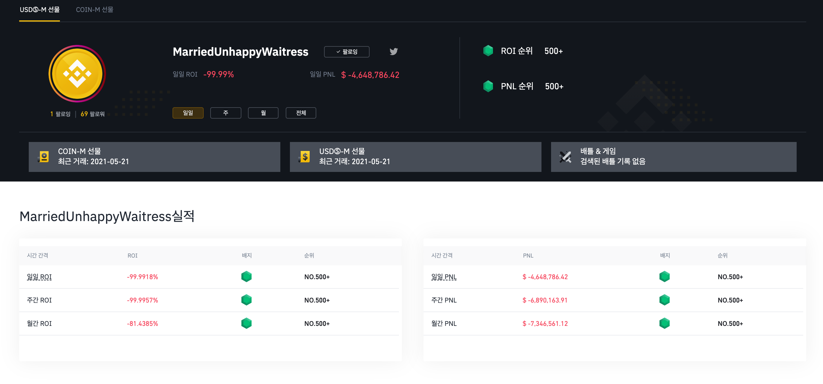 물론 저기서 청산을 당한 리더보드들의 전체 손익은 여전히 플러스이긴 합니다만, 반대로 어제 하루 만에 1,300억을 버신 리더보드 형님의 전체 손익은 여전히 1,400억 마이너스입니다.