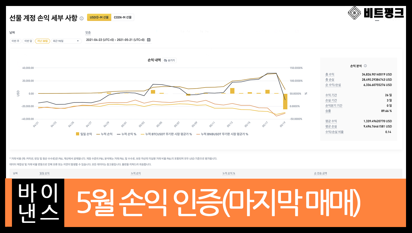 안녕하세요. 비트펑크입니다. 불과 며칠 전 2,3,4월 손익 인증을 했던 거 같은데 또 5월 손익 인증을 올리게 되었습니다. 아직 5월은 10일이 더 남았지만 이렇게 글을 올리는 이유는 이틀 전 다소 큰 손절 때문입니다.