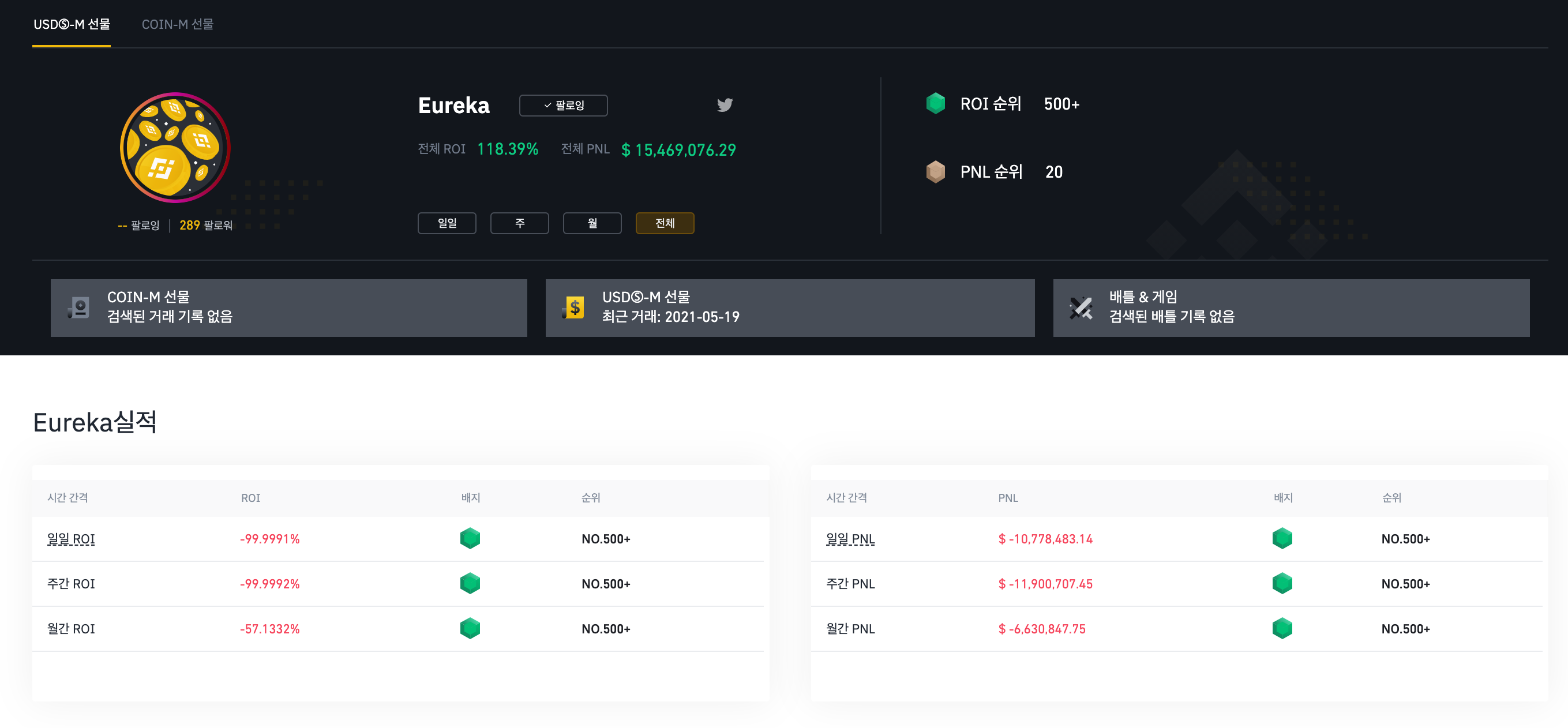 그래도 사실 여전히 수익인 상황이고, 변동성이 좋아 마음만 먹으면 단타를 치기도 괜찮은 장이긴 합니다. 그러나 결국 리스크를 감수하고 선물 매매를 하는 이유는 자산을 빠른 속도로 불리기 위함일텐데, 아래와 같이 리더보드 형님들의 손익을 보고 현타가 왔습니다.