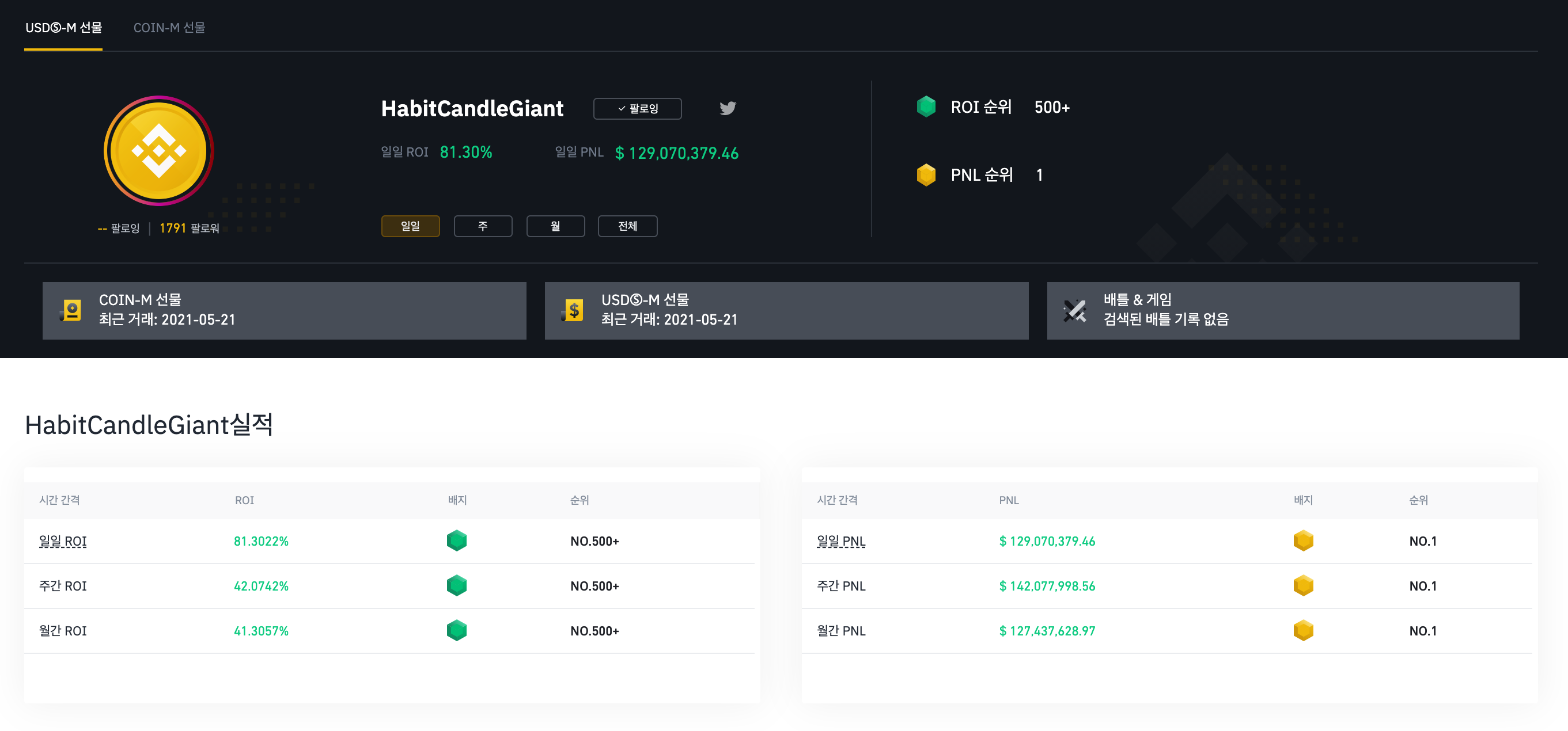 전설의 투기꾼이신 HabitCandleGiant 이 형님은 대상승장에서 숏만 치다 털리신 분인데, 결국 이렇게 반토막난 시드를 좀 회복하신 거 같습니다. (어제 제 소중한 2천 5백이 이 형님 주머니에 들어간 거 같은 인상을 지울 수가 없습니다. 흠... )
