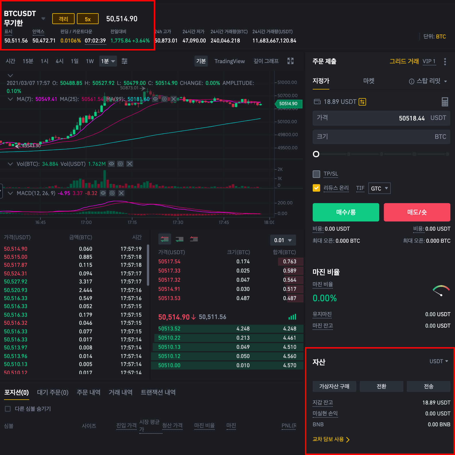 예를 들어, 아래 스크린샷의 잔고에서 확인할 수 있듯이, BTC/USDT 선물 계약의 경우에는 보유하고 있는 USDT가 사용할 수 있는 지갑 표시됩니다.