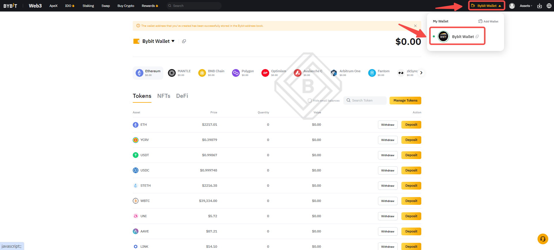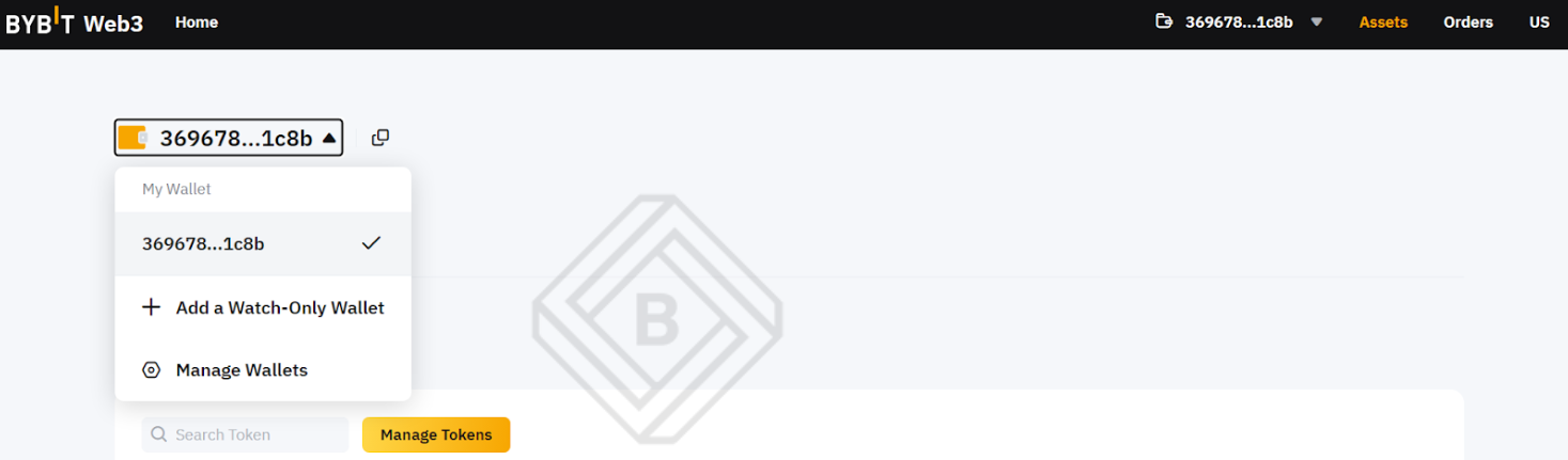 1단계: 바이비트 웹3 페이지의 오른쪽 상단에 있는 자산을 클릭하여 자산 페이지로 들어갑니다. 그런 다음 지갑 주소 옆의 삼각형 아이콘을 탭하고 [보기 전용 지갑 추가]를 선택합니다.