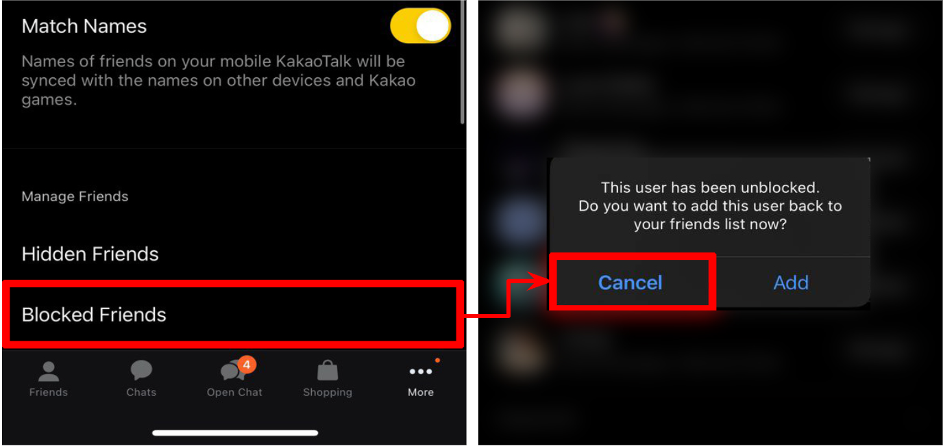 2. 설정 - 친구 탭으로 이동하여 차단을 해제하고 친구에 다시 추가하지 않기를 선택합니다.