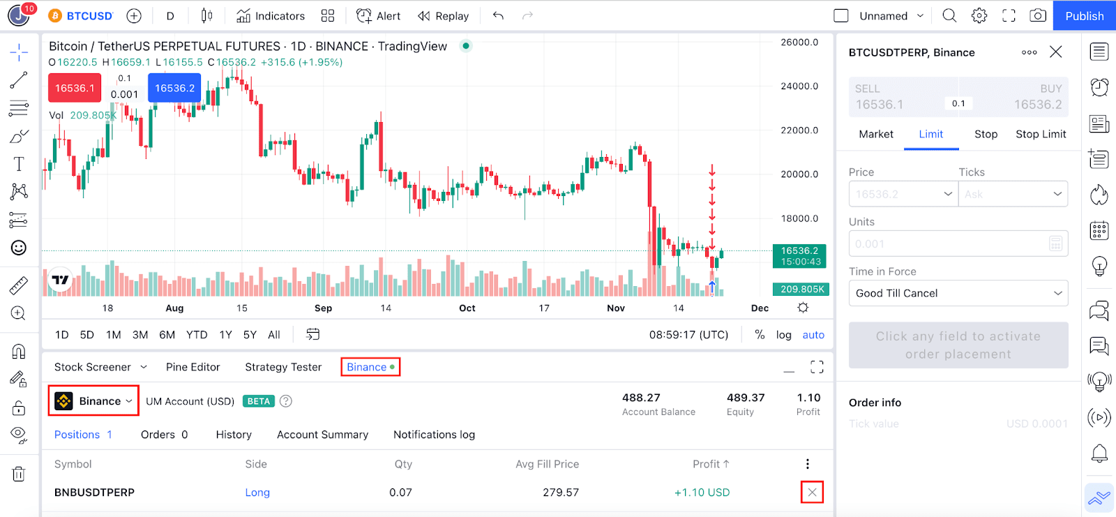 바이낸스 계정 연결이 완료되면 트레이딩뷰 인터페이스로 리디렉션됩니다. 현재는 USDⓈ 선물 계약만 사용할 수 있으며, 바이낸스에서 보유 중인 선물 포지션은 자동으로 트레이딩뷰 계정과 동기화됩니다.