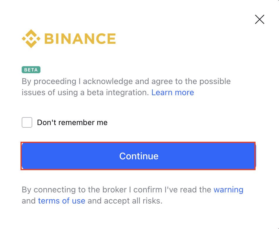 2. 계정 접근 권한이 표시되며 계속 [Continue]을 클릭하여 트레이딩뷰에 바이낸스 접근 권한을 부여합니다. 참고로 부여하는 권한은 자산 조회, 주문, 포지션 종료이며, 자산 이동이나 출금 권한은 부여되지 않습니다.