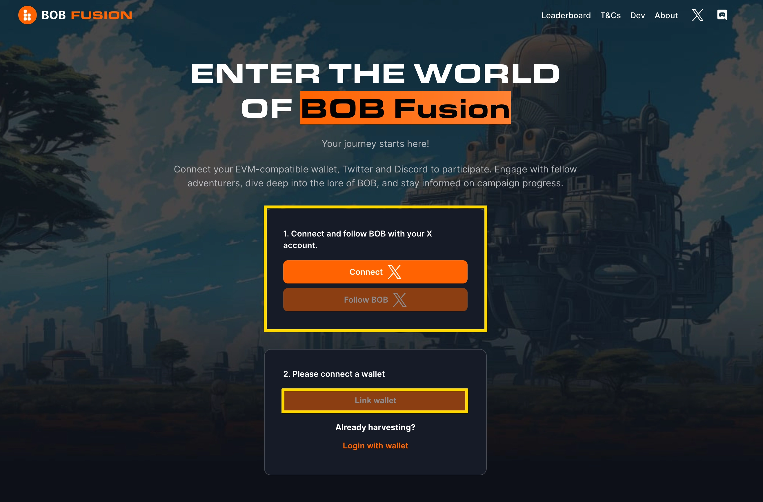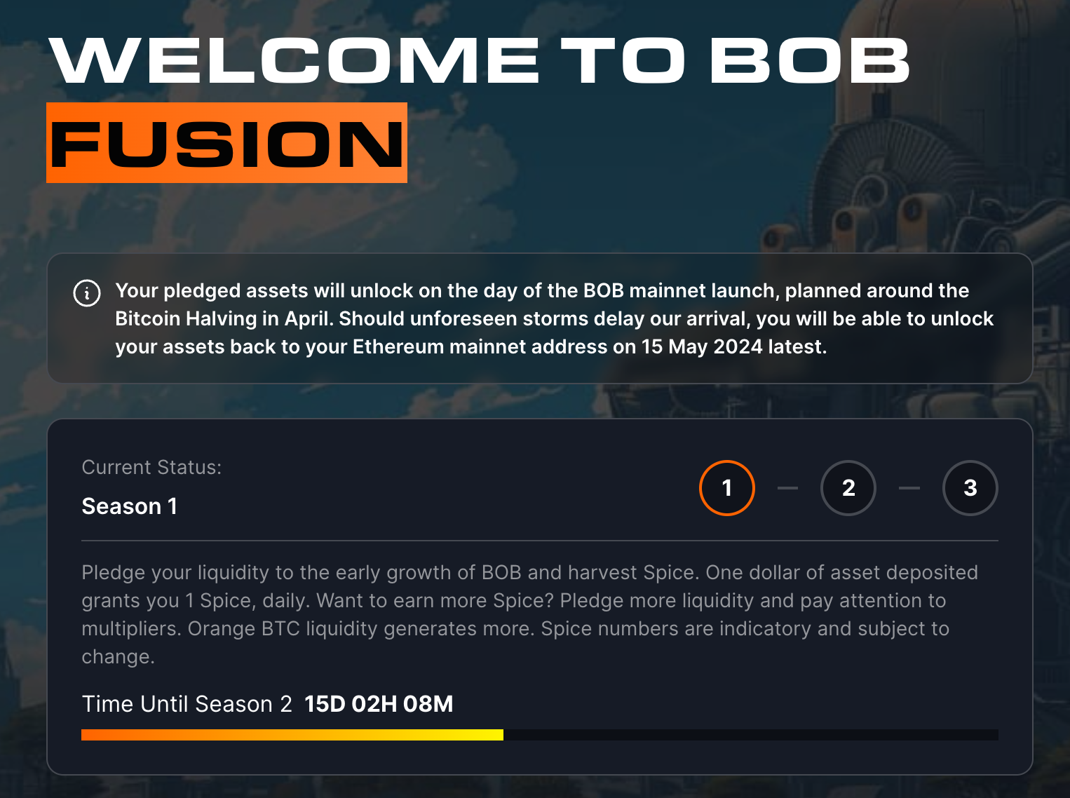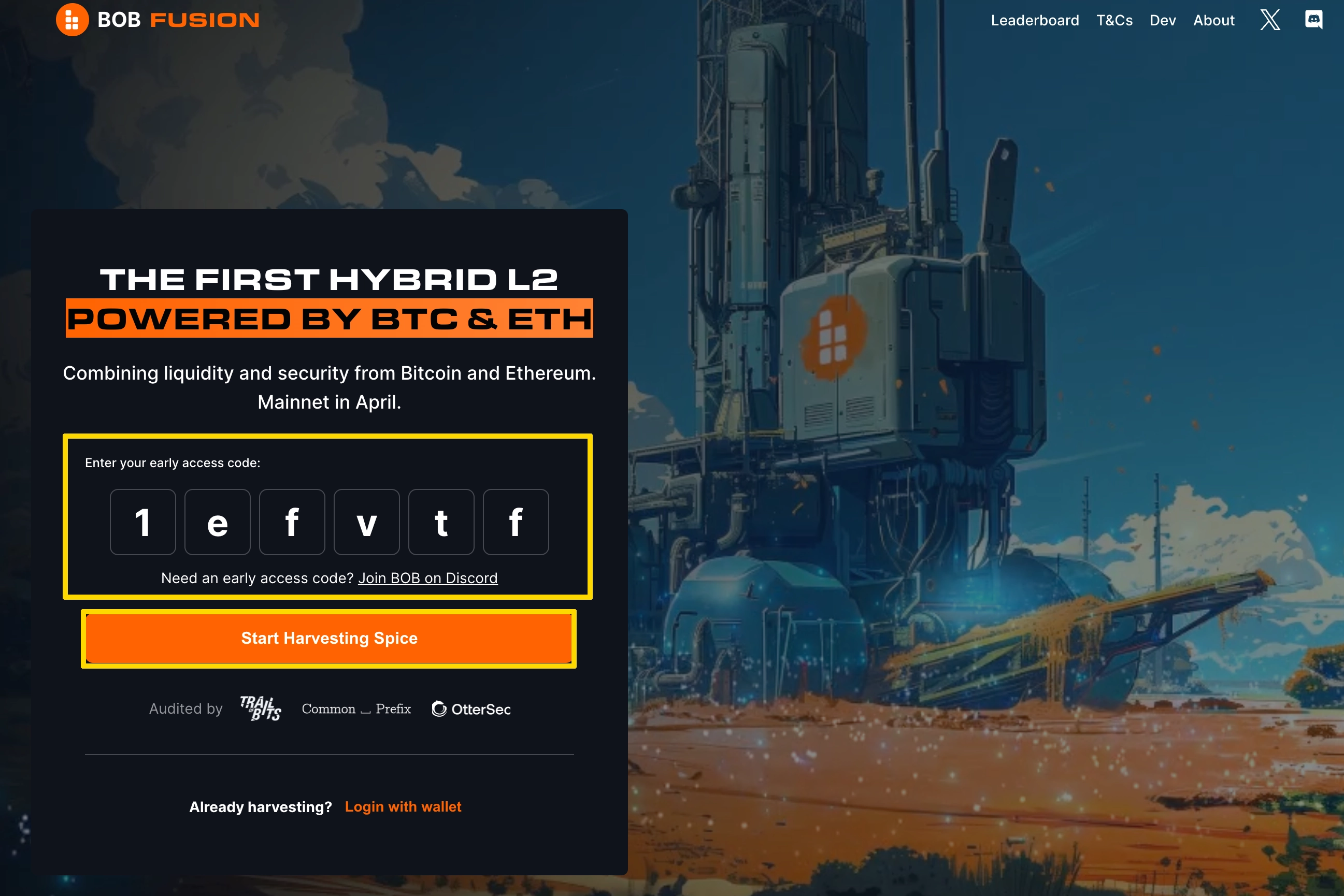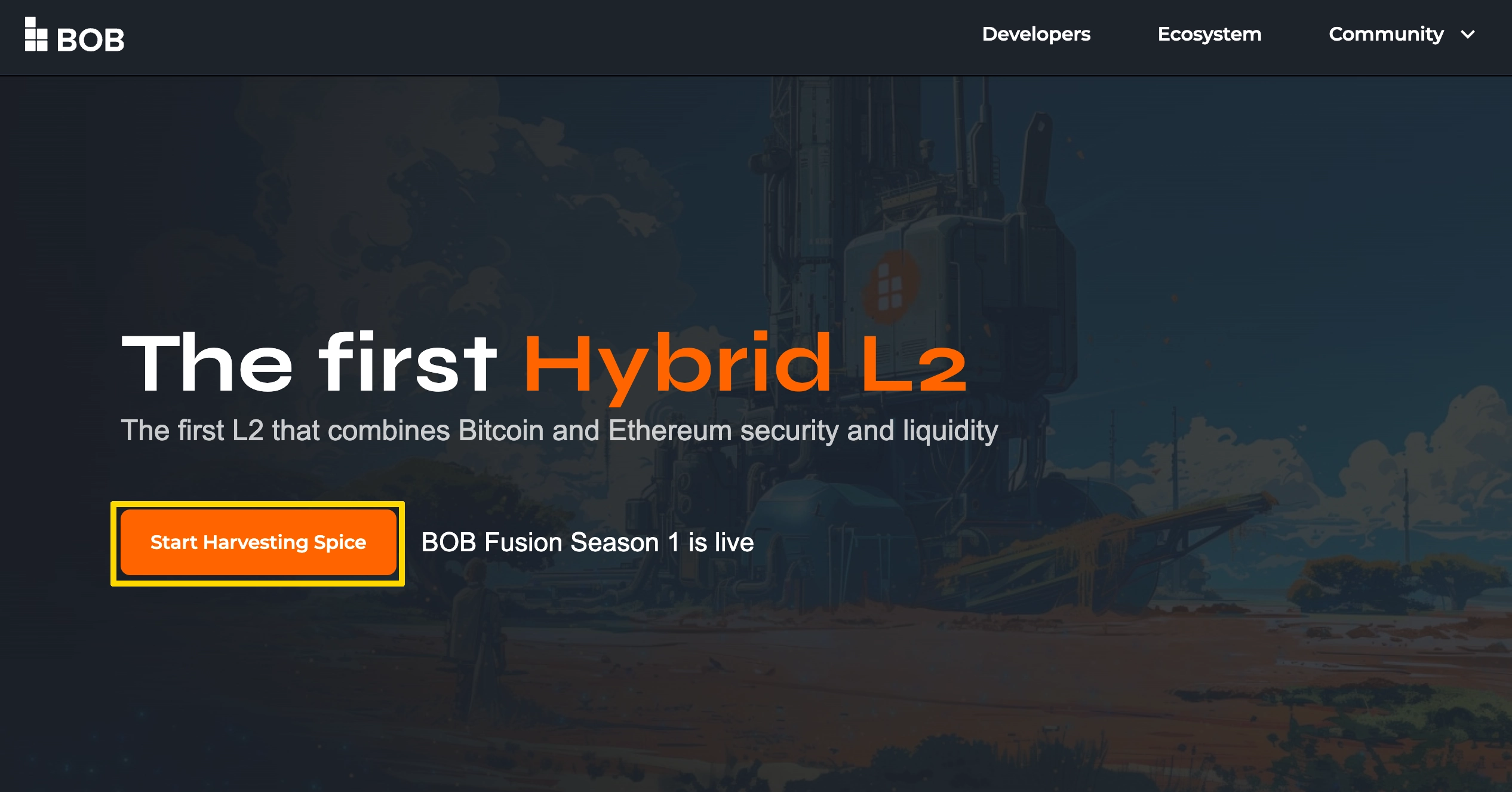 1. BOB 공식 홈페이지에 접속해주세요. "Start Harvesting Spice" 버튼을 클릭합니다.