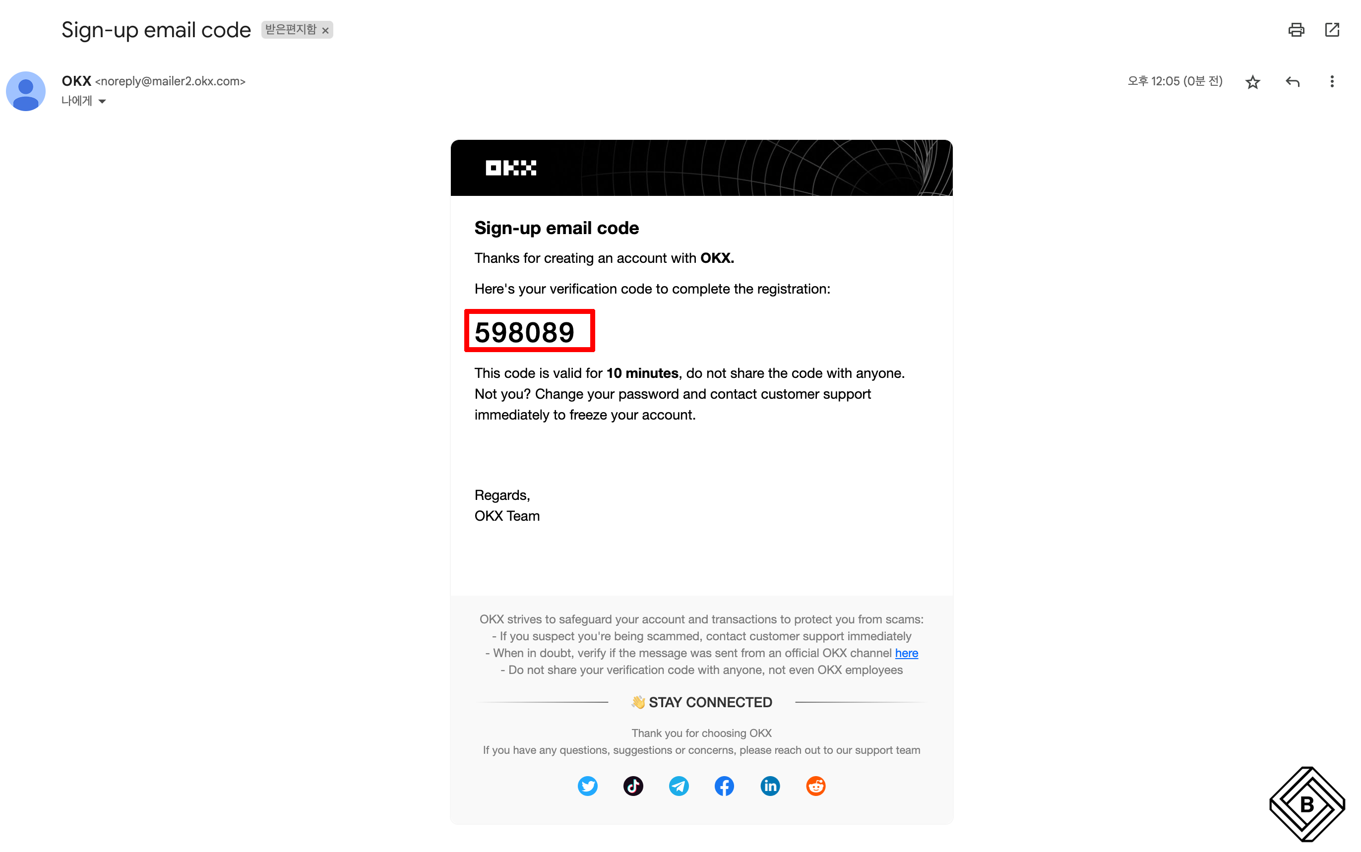 이메일을 인증할 차례입니다. 이메일의 수신함을 열어보면 OKX에서 전송된 6자리 코드가 입력된 가입 이메일 [Sign-up Email]이 있을 것입니다.