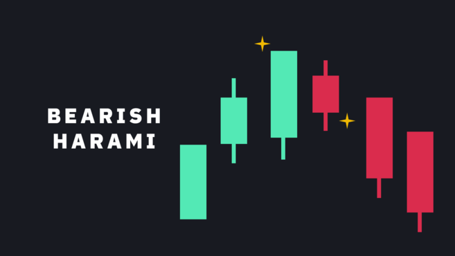 하락형 하라미는 긴 녹색 캔들 이후에 작은 빨간색 캔들이 이전 캔들 몸통 안에 완전히 들어있는 패턴입니다. 약세 하라미는 2기간 이상 지속될 수 있으며, 상승 추세가 끝날 때 나타납니다.
