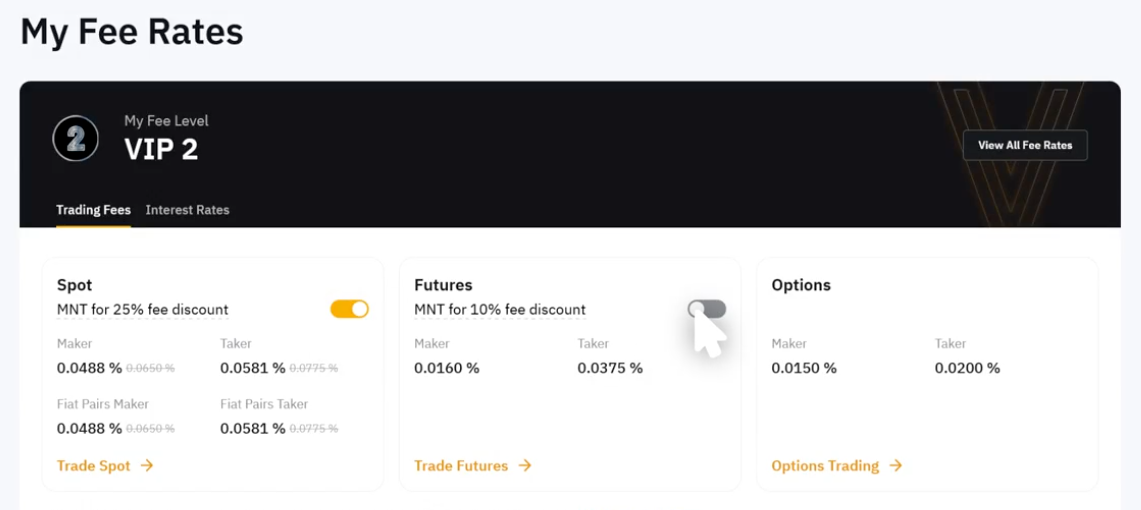 바이비트에서는 $MNT로 수수료를 지불하면 현물 최대 25%, 선물 최대 10%까지 수수료 할인을 받을 수 있습니다. 이를 설정하려면 바이비트 수수료 설정 페이지로 이동한 다음, ‘MNT 지불 옵션’을 활성화해주시면 됩니다.