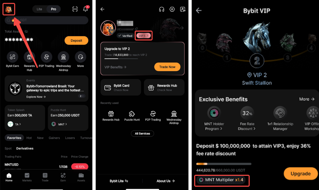 바이비트 VIP 등급이 높아지면 거래 수수료, 레버리지, 고객 서비스 등에서 큰 차이가 나는 특별한 혜택을 받을 수 있습니다. 거래소 계정에 $MNT를 보유하는 경우, 보유 자산에 부스팅이 적용되어 빠르게 VIP 등급을 높일 수 있습니다.