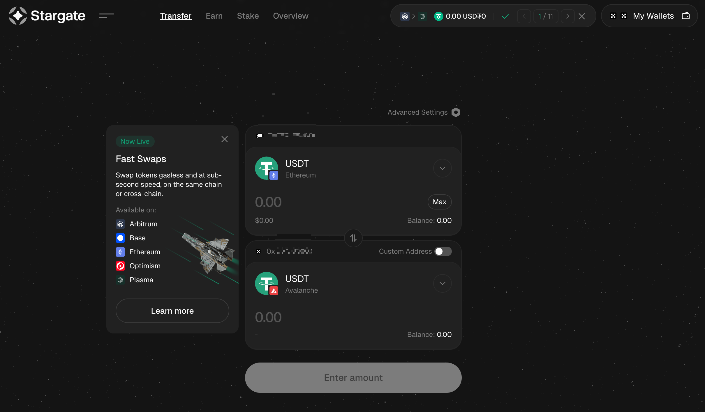 현재 자산을 보유한 체인과 토큰을 선택합니다. 예를 들어, 이더리움 네트워크상의 USDT를 선택할 수 있습니다. 다음으로 이를 전송할 대상 체인을 선택합니다. 예를 들어, 아발란체 체인을 선택할 수 있습니다.