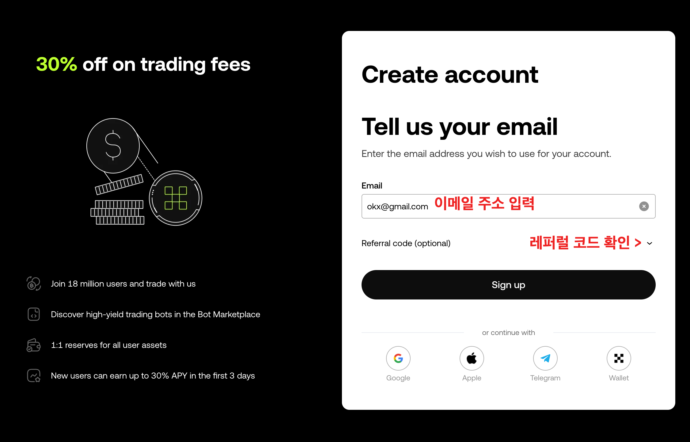 아래 링크를 통해 OKX 공식 웹사이트로 이동해주세요. 수수료 할인 혜택이 적용된 회원가입 페이지로 이동합니다.
