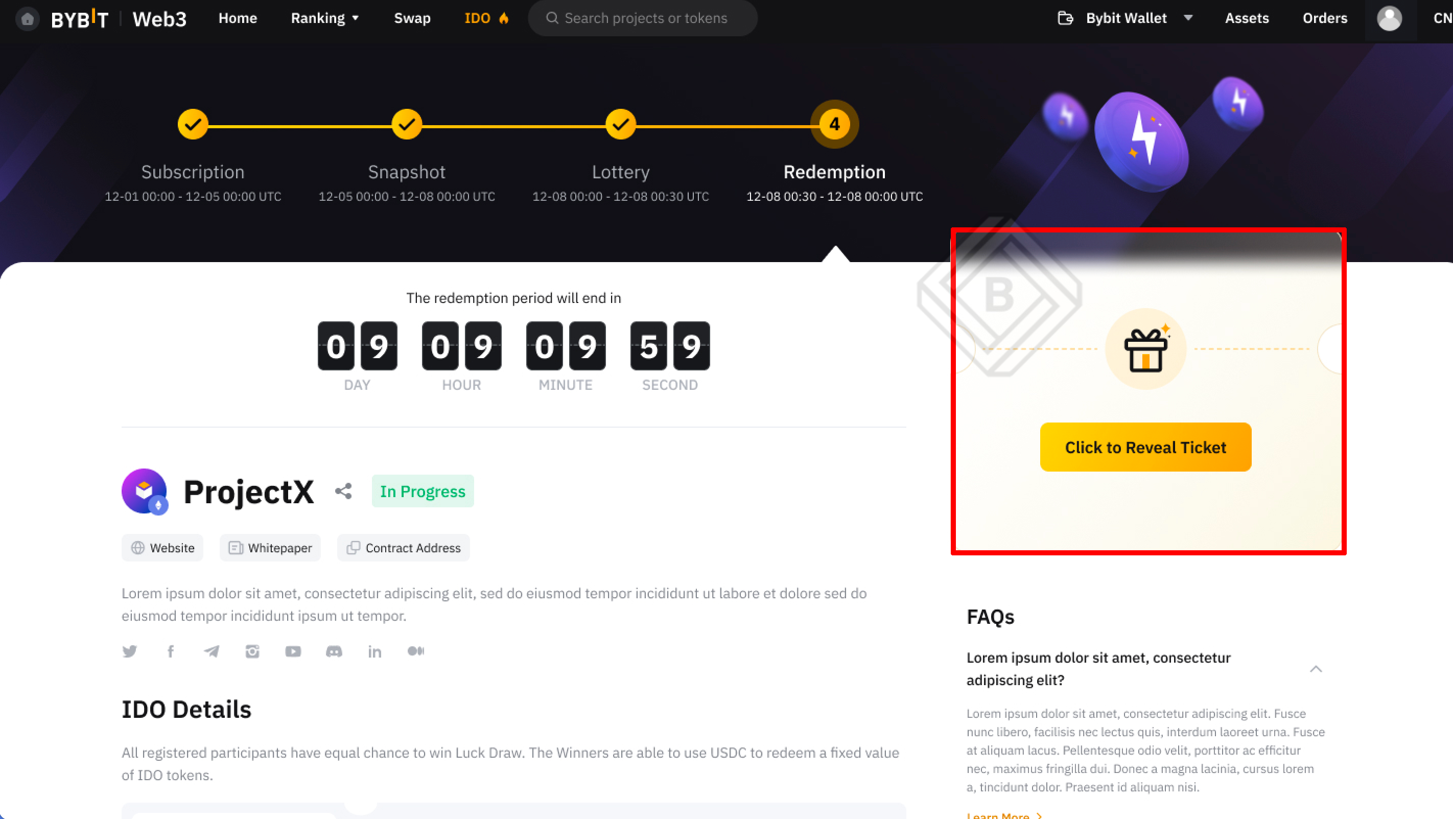 - IDO에 당첨된 사용자는 티켓을 교환하여 코인을 구매할 수 있습니다.