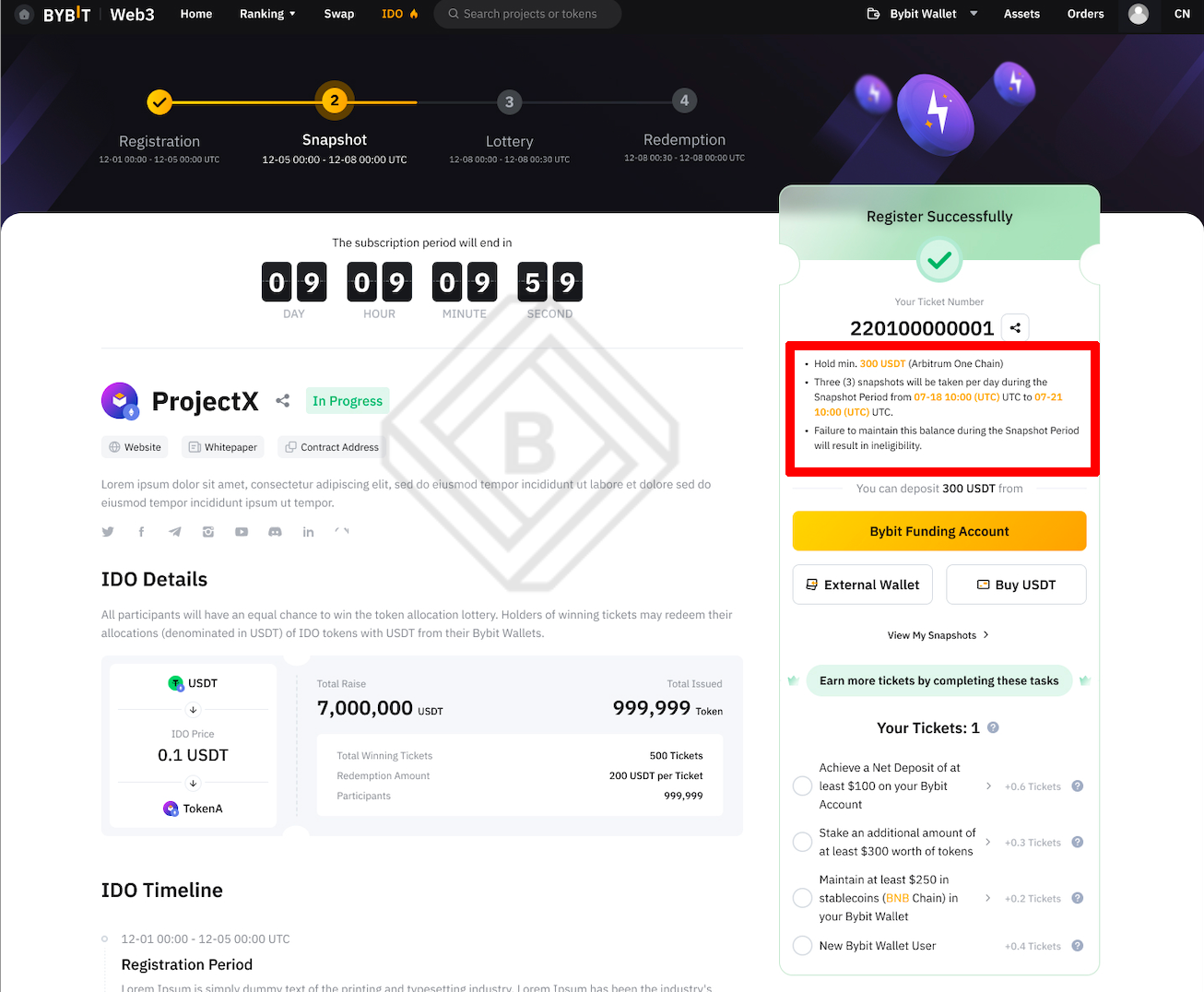 IDO가 진행되는 동안 스냅샷은 하루에 최대 3번 진행됩니다. 바이비트 웹3 지갑의 정확한 블록체인에 필요한 최소 자금 이상을 보유하고 있는지 한 번더 확인해주시기 바랍니다.