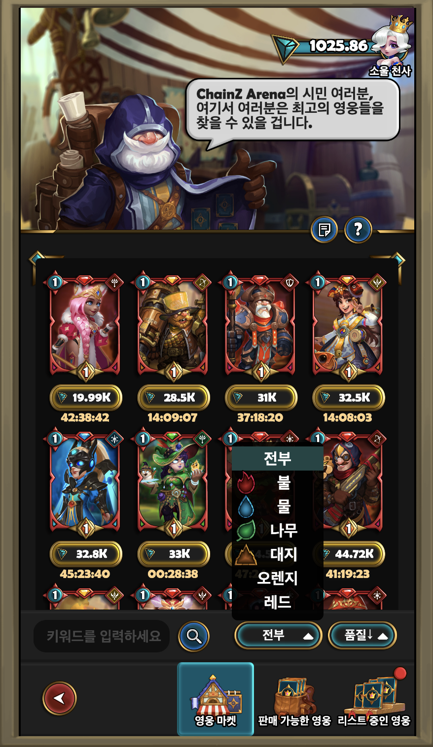 안녕하세요. 지난 글에서는 체인즈 아레나 덱 구성 방법과 추천 덱에 대해 알아보았는데요. 오늘은 영웅 마켓을 이용하는 방법에 대해 알아보도록 하겠습니다. 소환을 통해 원화는 영웅을 뽑는 것은 거의 불가능하기 때문에, 대부분의 유저분들이 마켓에서 선호하는 영웅을 구매해 덱을 구성하고 있습니다.