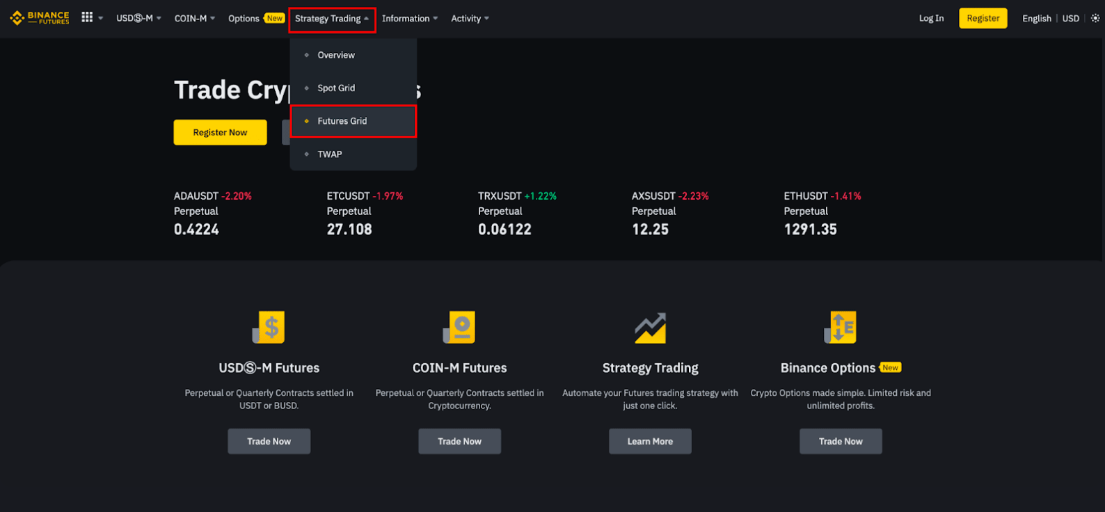 바이낸스 선물 거래 페이지로 이동한 다음 상단 메뉴에서 [전략 거래] [Strategy Trading]를 선택한 다음 [선물 그리드] [Futures Grid]를 선택합니다.