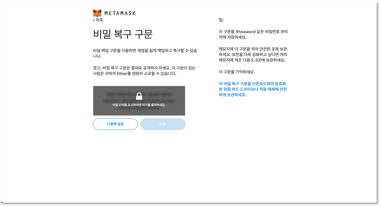 충분히 시간을 들여 화면에 표시된 비밀 시드 문구를 안전한 곳에 백업하세요. 이 때, 사진을 찍거나 그대로 복사해서 카카오톡에 붙여넣거나 이메일로 전송해두시면 안 됩니다. 반드시 오프라인 종이에 적어 두시거나 또는 자신만 알아볼 수 있는 방법으로 시드 문구를 조금 바꿔서 저장해두는 것이 좋습니다.