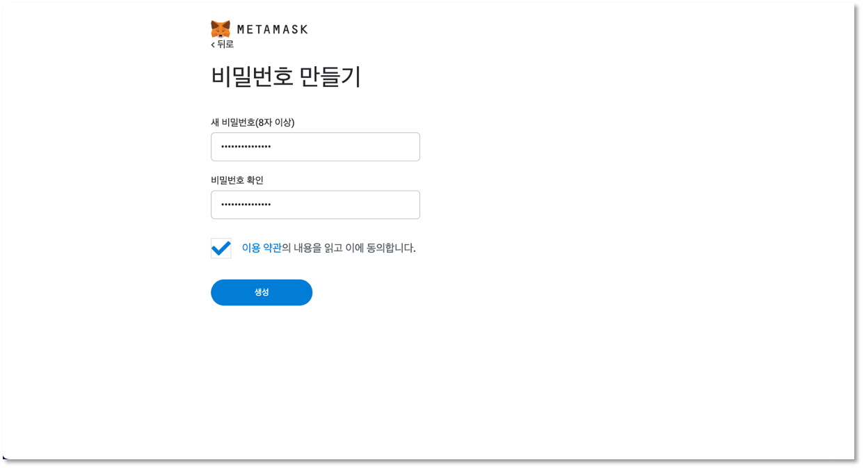 다음으로 넘어가기 전에 비밀번호를 만들어야 합니다. 이는 메타마스크에 로그인할 비밀번호로 사용됩니다. 아래와 같이 다소 긴 비밀번호를 설정해두시는 게 안전한데요. 이 비밀번호는 메타마스크 프로그램을 재설치하면 초기화되니 비밀번호를 잊으신 경우에는 재설치를 하시면 됩니다.