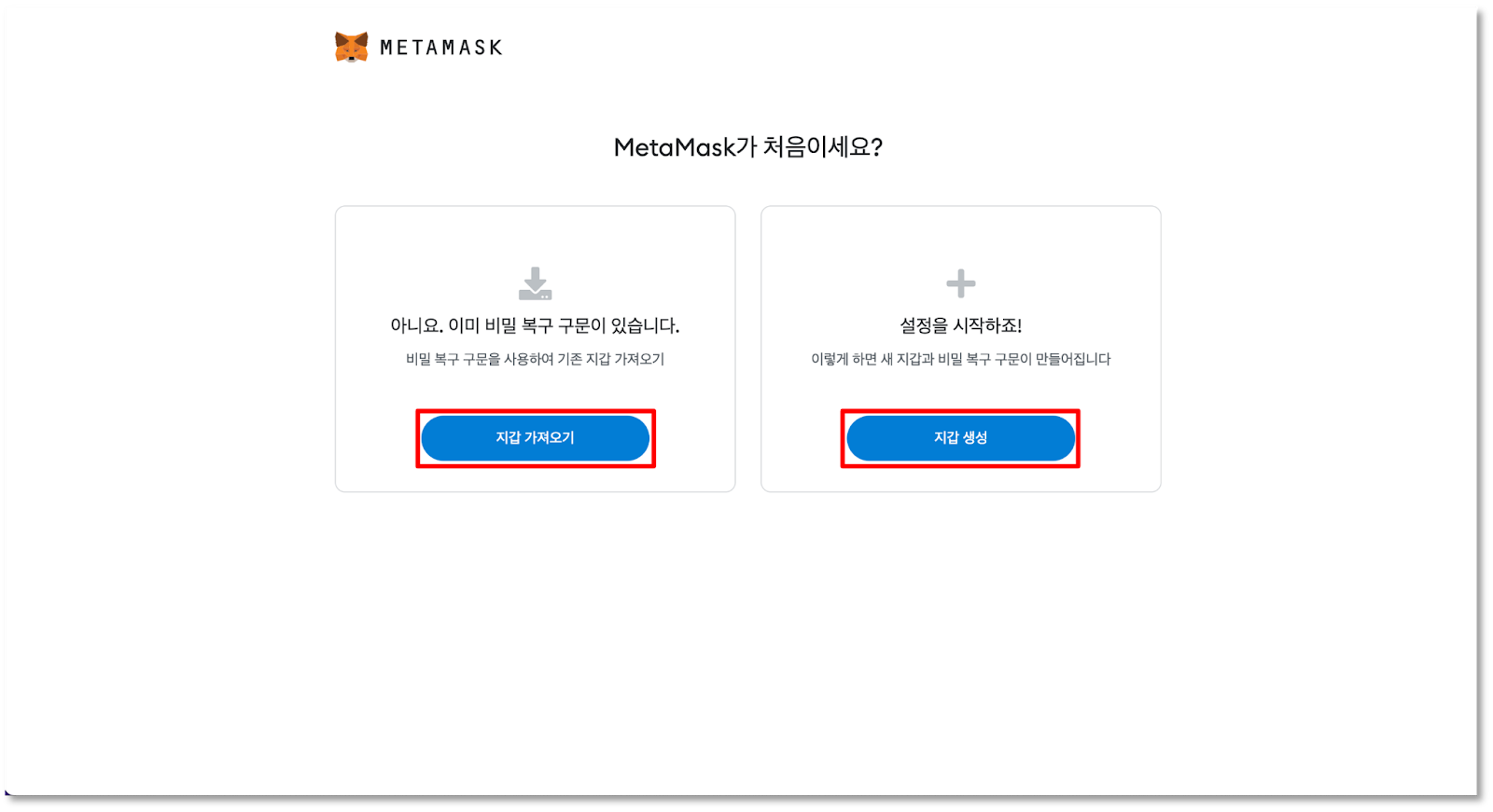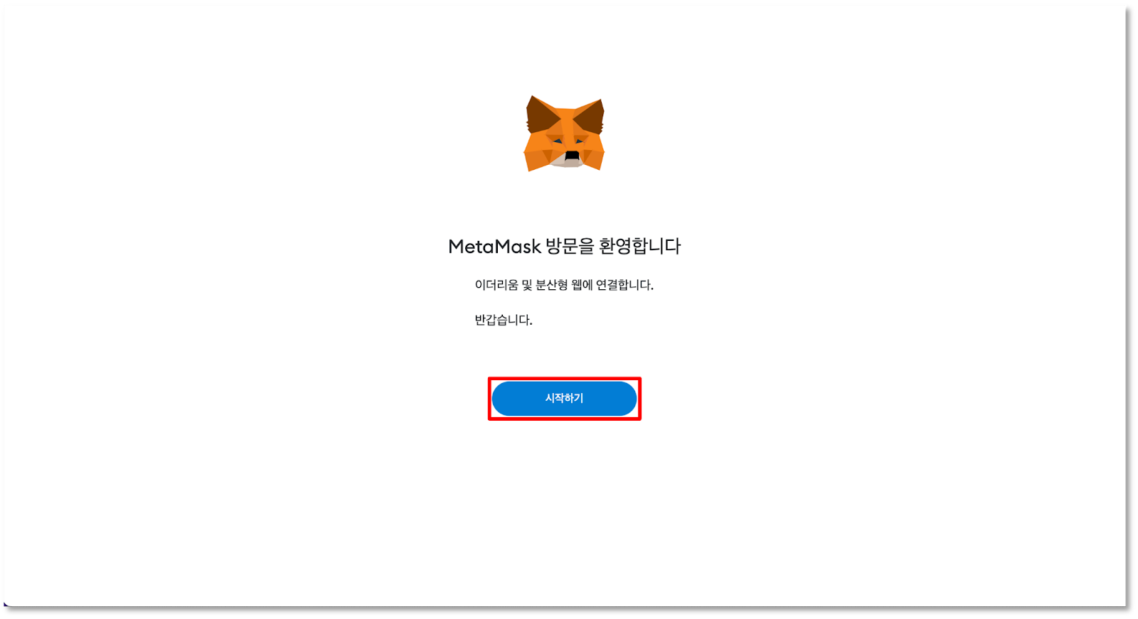 다운로드를 잘 마치셨나요? 이제 메타마스크를 처음 실행하면 아래와 같이 지갑 설정 화면이 표시됩니다.