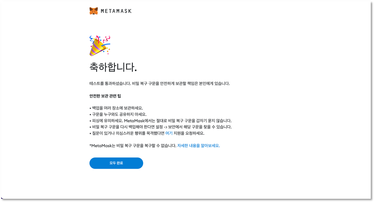 지금까지의 과정이 다소 번거로운 절차라고 느낄 수 있지만 여러분의 소중한 자금을 보호하기 위한 필수적인 과정이니 언제나 안전하게 시드 문구를 백업하고 관리하시기 바랍니다.