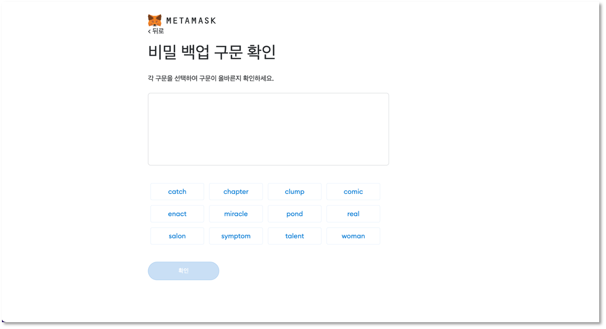 이제 마지막 한 단계만 거치면 지갑 생성이 완료됩니다. 앞에서 백업한 시드 문구를 순서에 맞게 입력하세요. 단어 순서가 모두 정확해야 지갑이 생성됩니다!