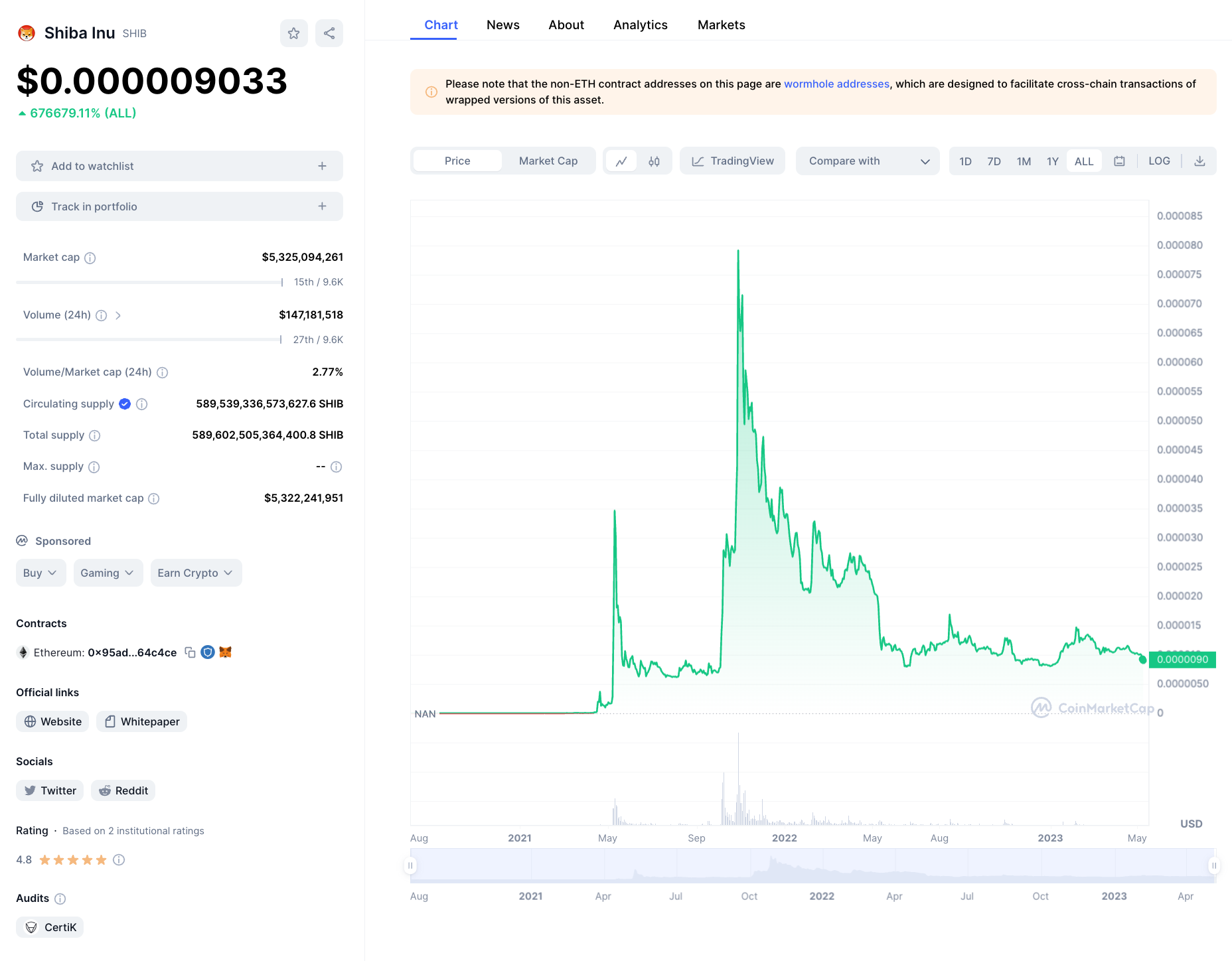 밈 코인은 모든 가상자산 코인들이 크게 상승한 해였던 2021년에 큰 인기를 끌었습니다. 이 시기에 도지와 시바 또한 밈 코인의 대장주가 되어 가격과 시가 총액이 급등했습니다. 도지 코인은 출시 이후 8,000% 이상 상승했으며, SHIB는 단 몇 개월만에 600,000% 이상 상승하기도 했죠.