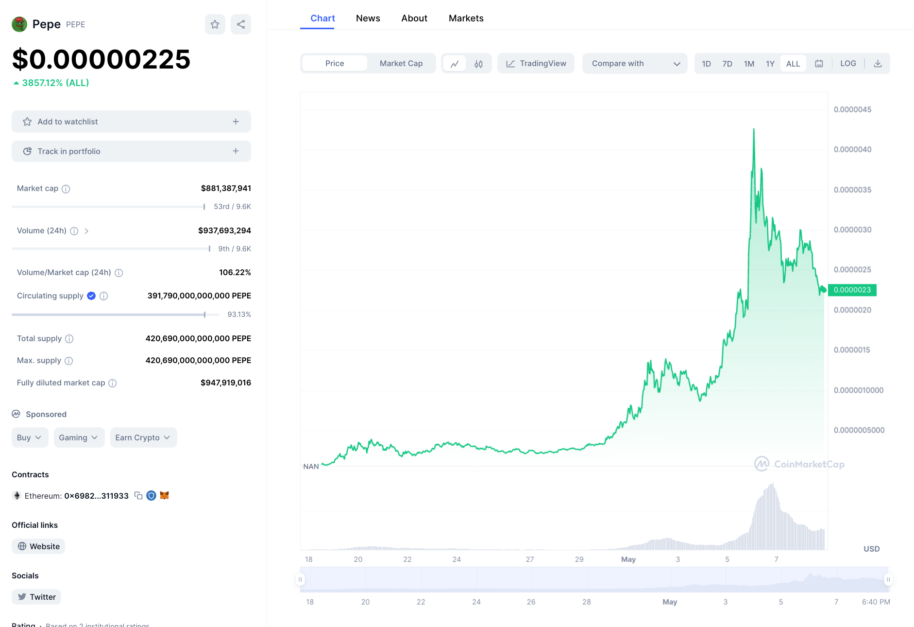 밈 코인의 가장 큰 특징 중 하나는 가격 변동이 무척 빠르다는 것입니다. 일례로 최근에 큰 인기를 얻은 페페(PEPE) 코인은 단 며칠만에 60,000% 가까이 상승했습니다. 또한 바이낸스, OKX, 바이비트 등과 같은 중앙 거래소에도 상장했습니다.