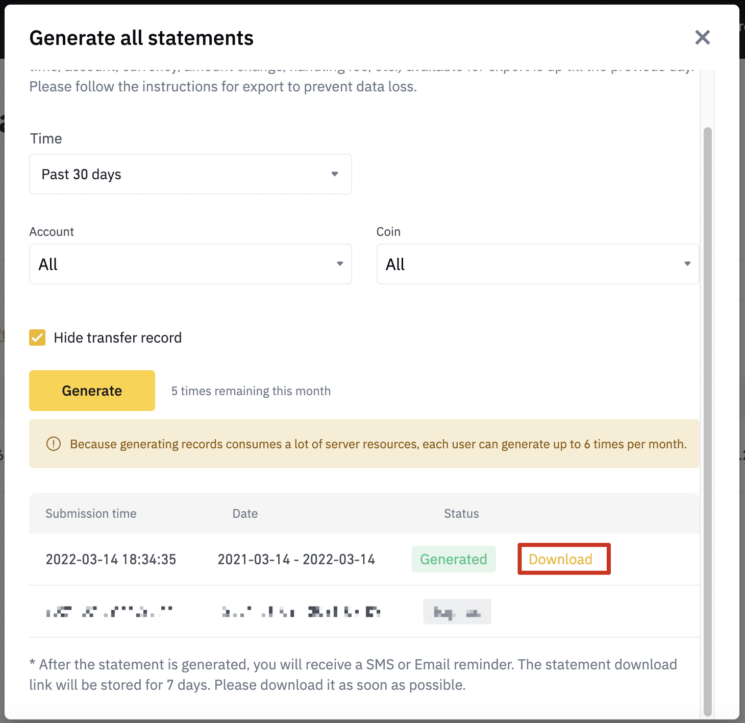 명세서에 표시할 기간, 계정 및 코인을 선택한 다음 [Generate]를 클릭합니다. 기록 생성에는 서버 자원이 사용되기 때문에 각 사용자는 한 달에 최대 6회까지만 생성할 수 있습니다.