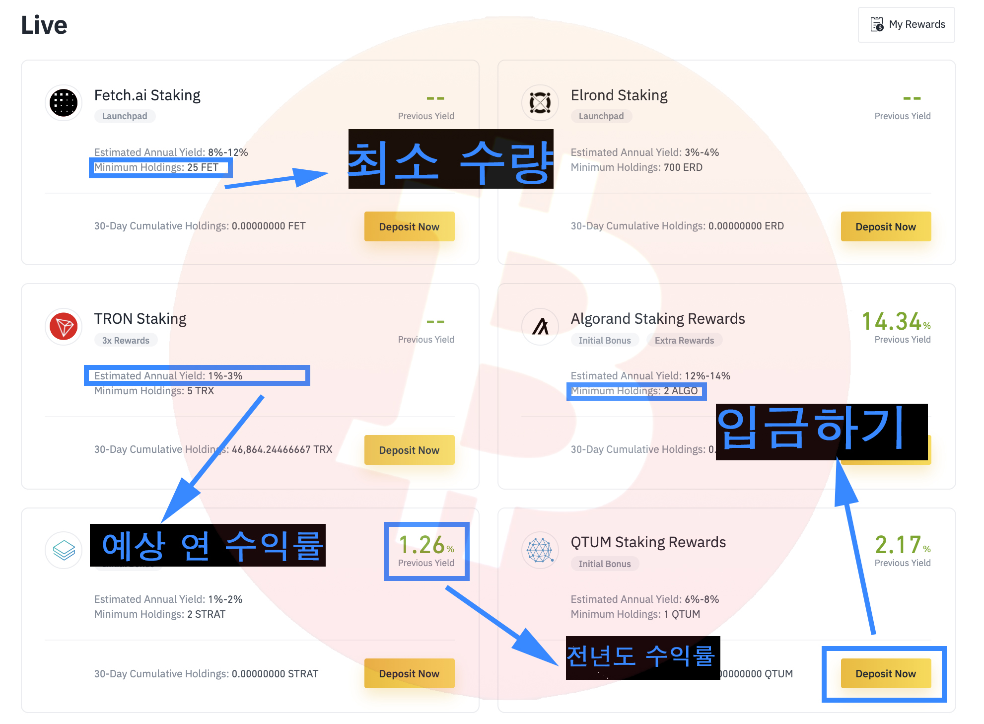 현재 바이낸스에서는 스텔라(XLM), 알고랜드(ALGO), 네오(GAS), 온톨로지(ONG), 비체인(VTHO), 트론(BTT), 코모도(KMD), 스트라티스(START), 큐텀(QTUM) 등의 스테이킹을 지원하고 있습니다. 바이낸스에서 지원하는 코인을 존버하고 계시거나, 물려 계신 분들이라면 바이낸스에 옮겨두는 것도 좋겠죠.