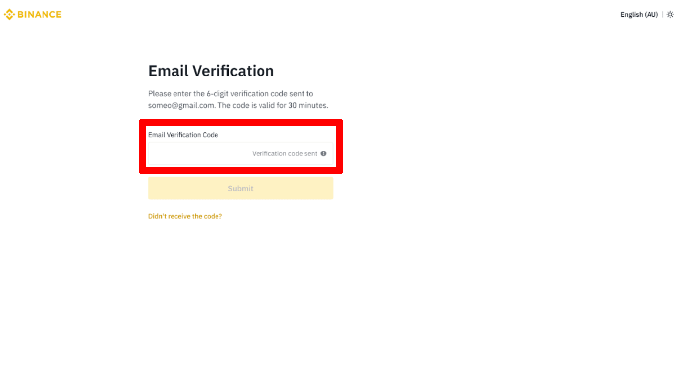 입력하신 이메일 또는 휴대전화로 6자리 인증 코드가 도착할 것입니다. 화면에 6자리 숫자를 정확하게 입력하시고 제출 [Submit] 버튼을 클릭하세요. 코드가 정확하다면 바이낸스 계정이 생성됩니다.