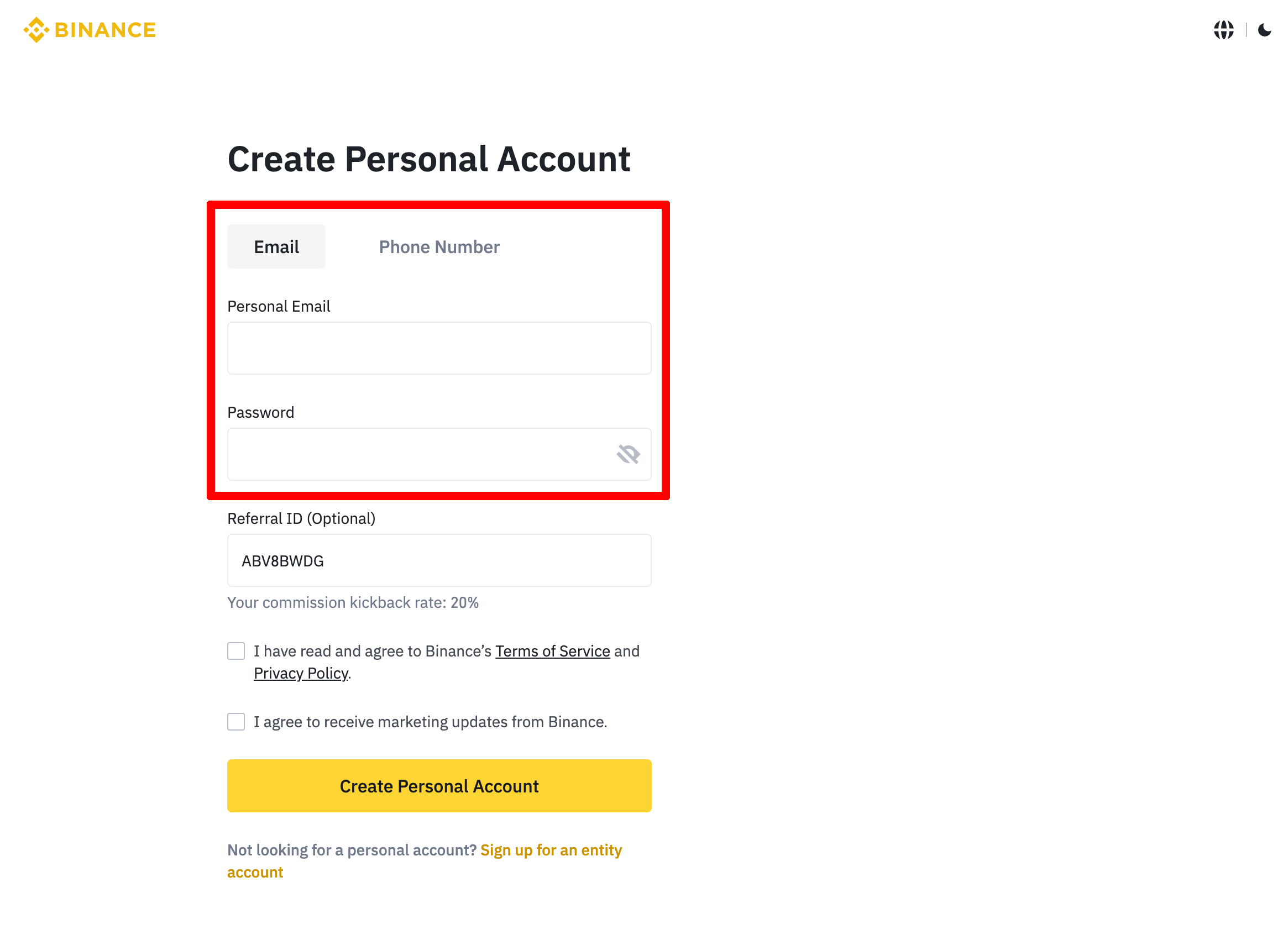 바이낸스 회원가입에 사용할 이메일과 비밀번호를 입력하세요. 이메일로 가입하시는 것이 보안에 좋지만 간편하게 휴대전화로 가입하실 수도 있습니다.