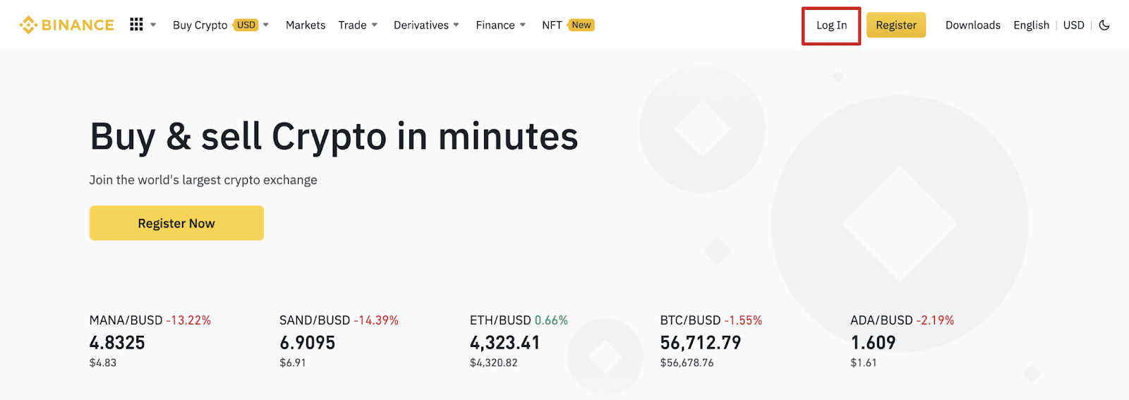바이낸스 홈페이지로 이동하여 [로그인]을 클릭합니다. 바이낸스 앱을 사용하는 경우 [Loing/Register] 버튼을 클릭하세요.