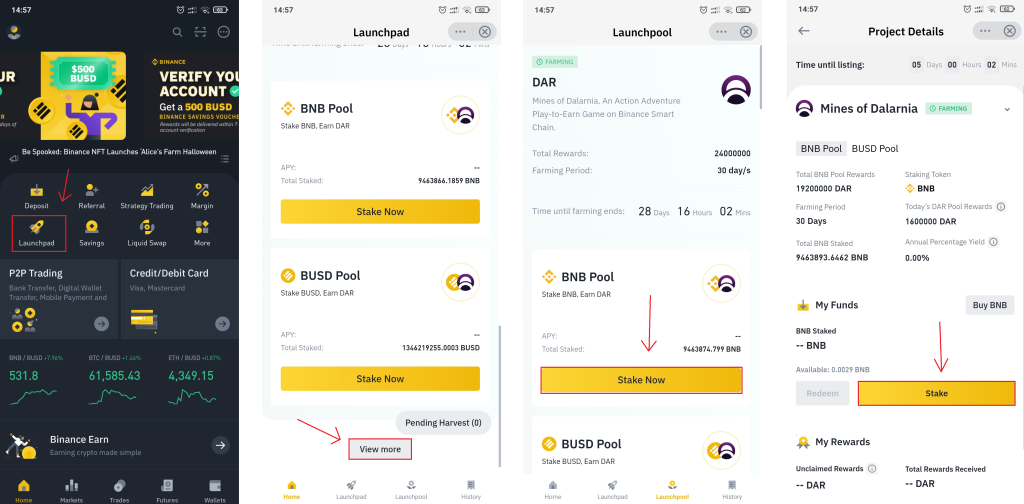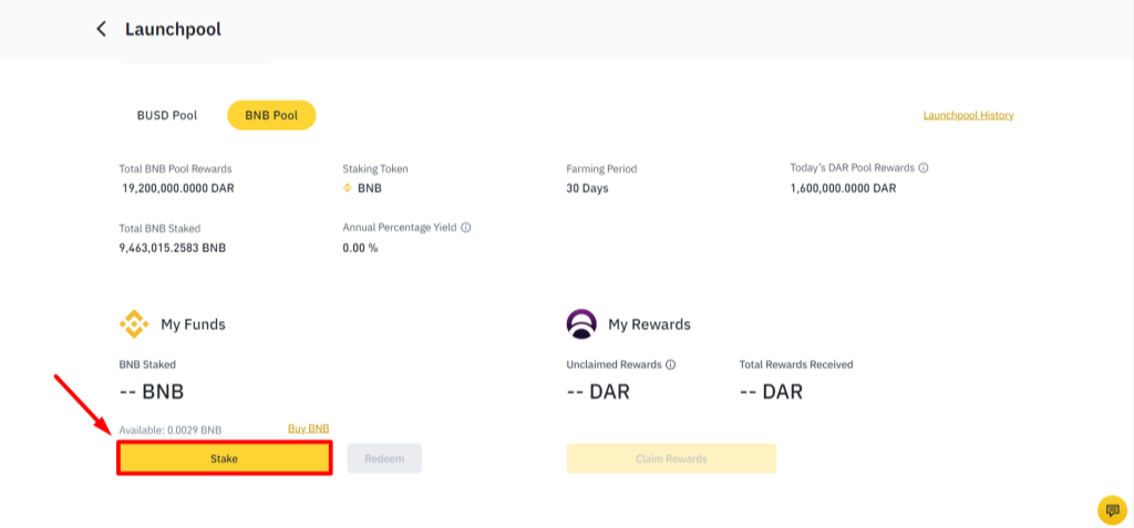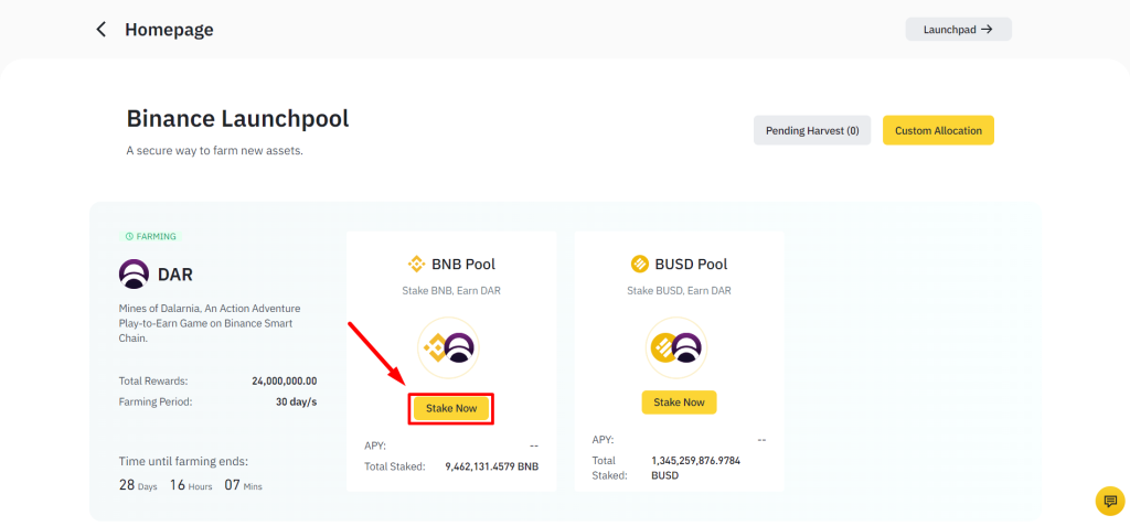 2단계: 토큰을 스테이킹할 풀을 선택해주세요. DAR 런치풀을 예로 들어보겠습니다. BNB 풀에 참여해보겠습니다. 아래의 노란색 버튼 "지금 스테이킹"을 클릭해주세요.