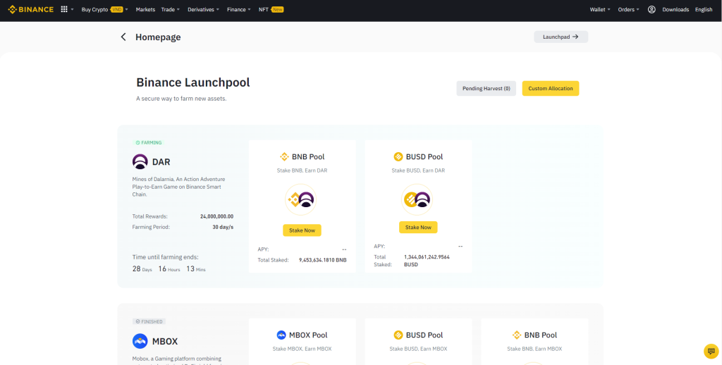 1단계: 바이낸스 런치풀로 이동해주세요. 아래와 같이 현재 진행 중인 런치풀 프로젝트와 세부 정보를 확인하실 수 있습니다.