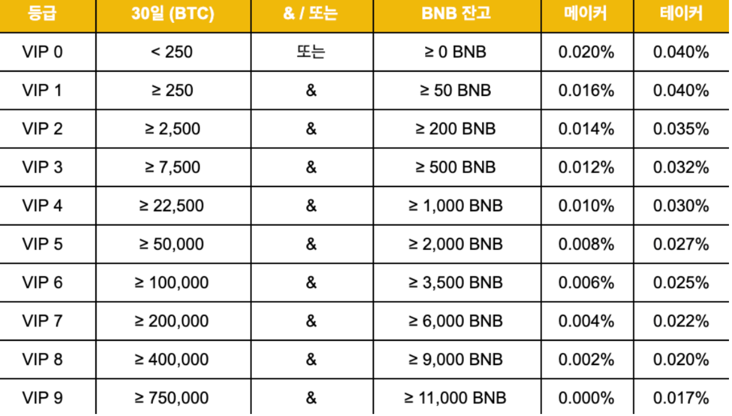바이낸스 거래소에 최대 할인이 되는 레퍼럴 코드로 가입 시 VIP 1등급이 상향되는 효과가 있습니다. 250 BTC(≈ 140억) 이상을 거래하고 50 BNB(≈2,500만원)를 보유하지 않고도 VIP 혜택을 받을 수 있는 것이죠. 다음은 VIP 등급에 따른 바이낸스의 수수료 체계입니다.