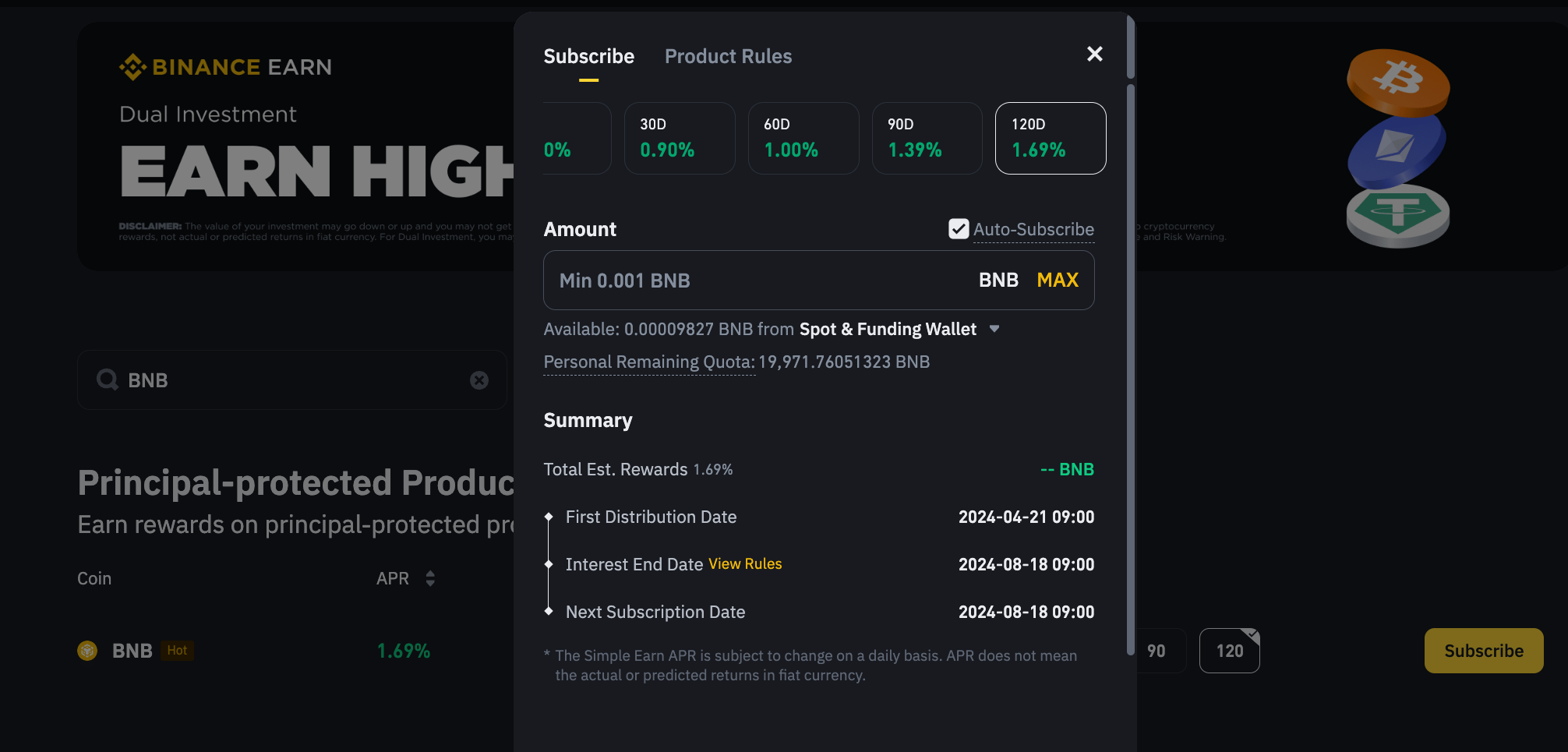- BNB 스테이킹 상품 신청: 바이낸스 수익 창출로 이동하여 BNB 스테이킹에 참여하세요.