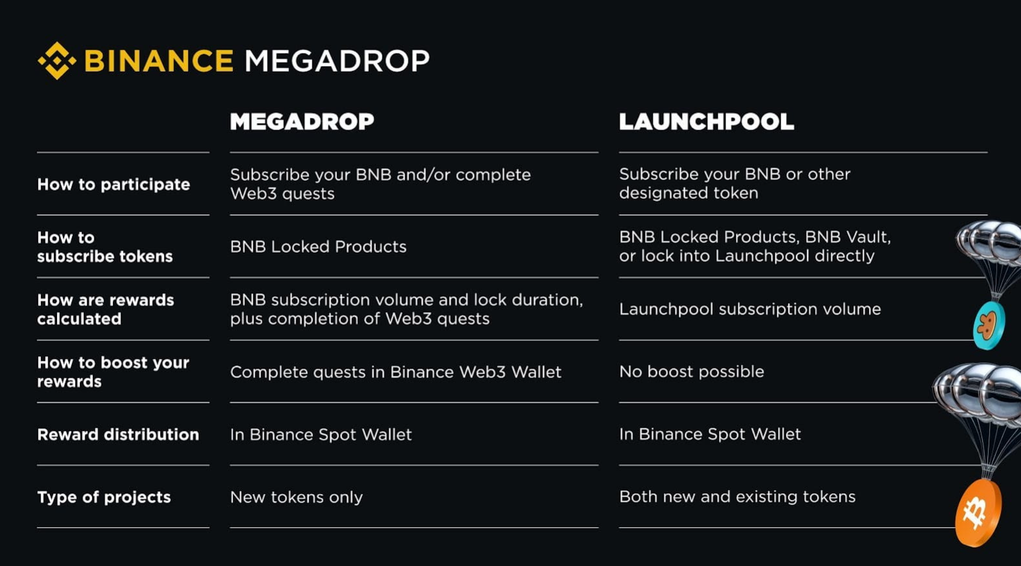 바이낸스 거래소에서 메가드랍(Megadrop)이라는 새로운 토큰 출시 플랫폼을 런칭했습니다. 기존의 런치패드 및 런치풀과 유사하지만, BNB 코인 스테이킹 및 웹3 퀘스트에 초점을 맞추고 있다는 점에서 차이가 있는데요.